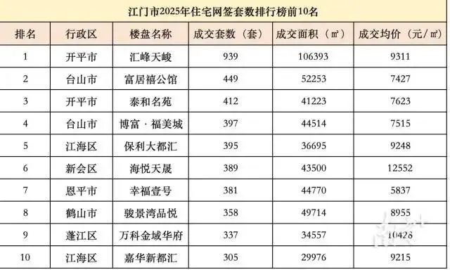 从区域市场看,开平市、台山市表现突出。开平市汇峰天峻以成交939套,成交面积10.64万㎡,总金额约9.9亿元,包揽2025年江门市住宅网签套数、面积、金额三项榜首;泰和名苑自去年5月首次开盘以来,凭借产品竞争力实现库存快速去化,以住宅网签套数412位列全市住宅网签套数榜单第三。
