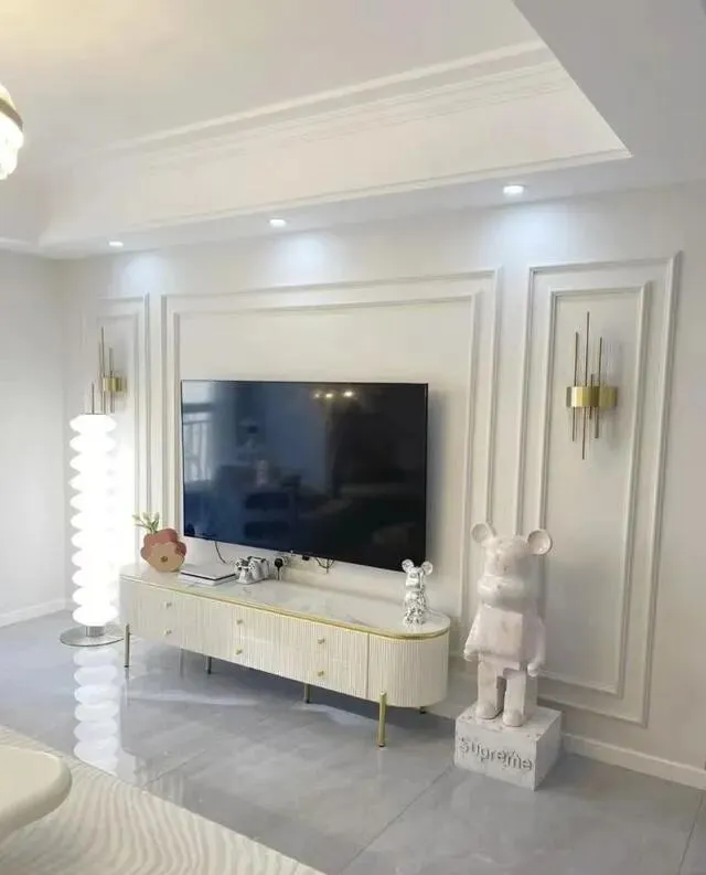 客厅两面背景墙 , 用的石膏线加乳胶漆 , 特别简单的组合。