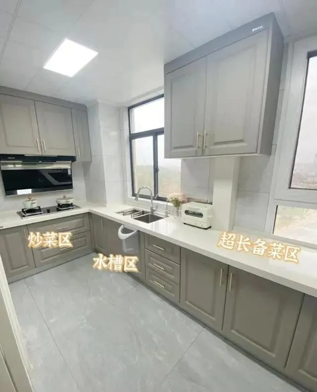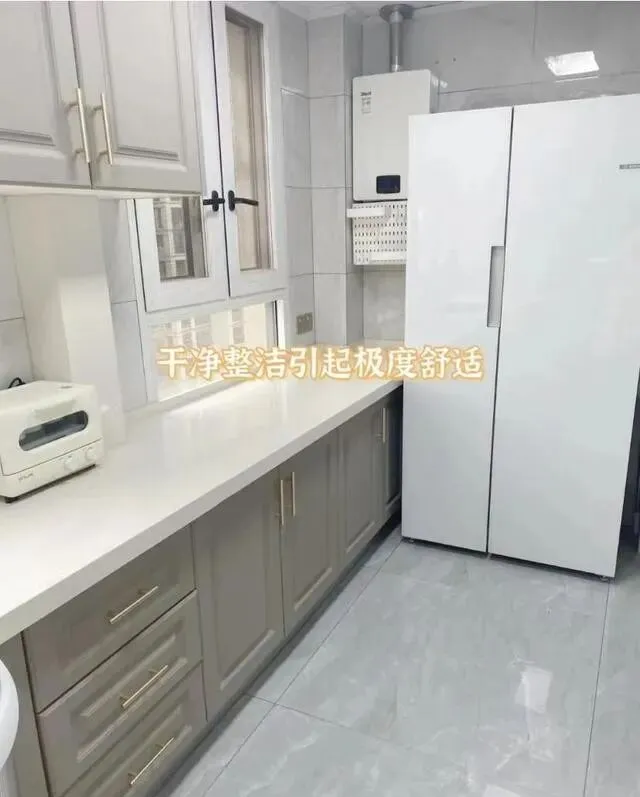 厨房原本挺小的 , 他们直接把旁边阳台打通了。