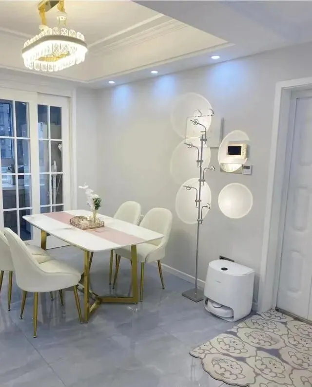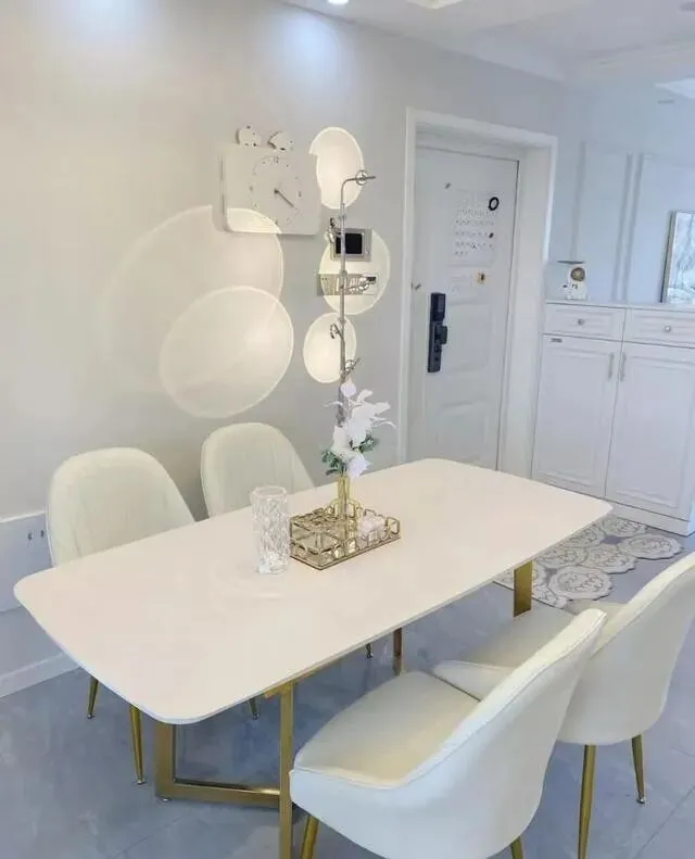 餐桌选的白色岩板 , 桌腿是金色M字型的 , 有点轻奢那味儿了~
