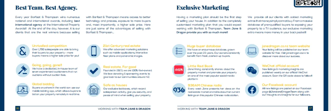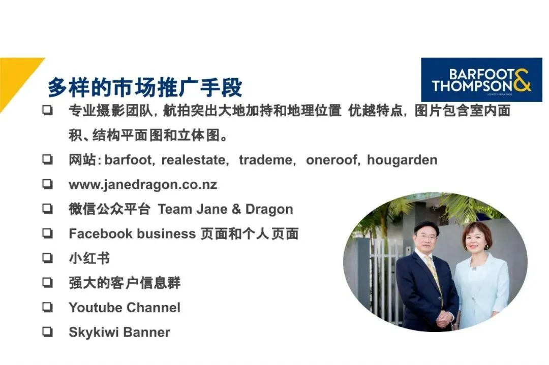 📣 三、社交媒体 & 数据直推 | 精准营销🎯 Jane & Dragon专属购房者数据库 – 直达高净值买家、投资者 🎯 Barfoot & Thompson E-Magazine – 内部买家资源直达 🎯 团队社交媒体矩阵推广 – 裂变传播,声量最大化