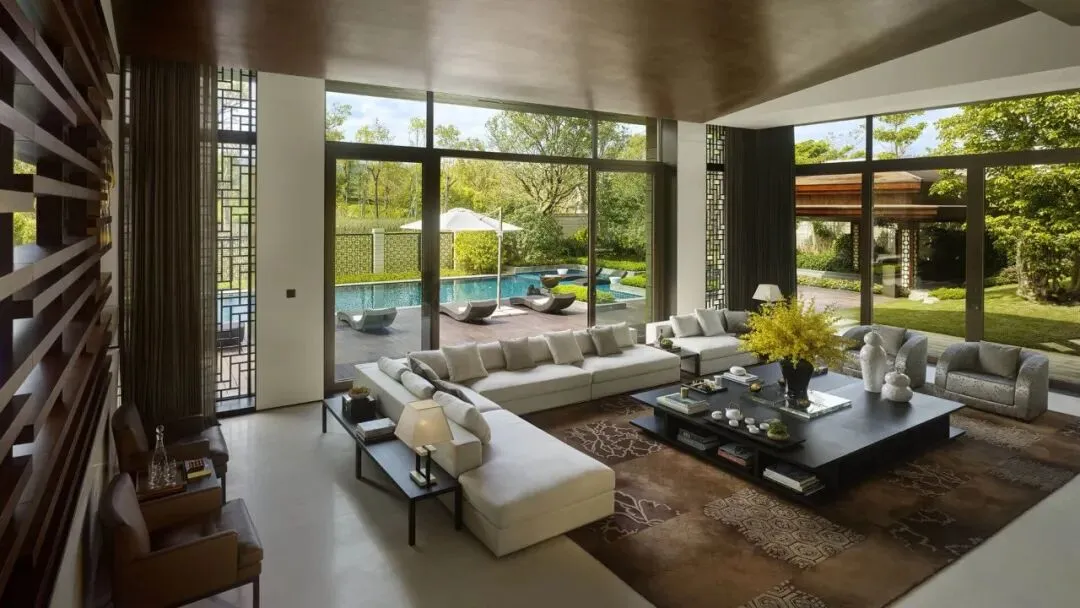 它被克林顿誉为中国的安纳伯格庄园,每户都自带花园、泳池和温泉泡池,其中,一期采用中式皇家传统九宫格布局,以院落分区,以连廊相通,形成前院、中庭、后花园再延伸至室内空间,将大宅的境界带至依山傍水的自然美景之中;二期则拥有更宽阔的内部空间,装饰风格也更简洁现代,连接户外层次丰富的绿植园林,营造更加轻松愉悦的商务与度假氛围。