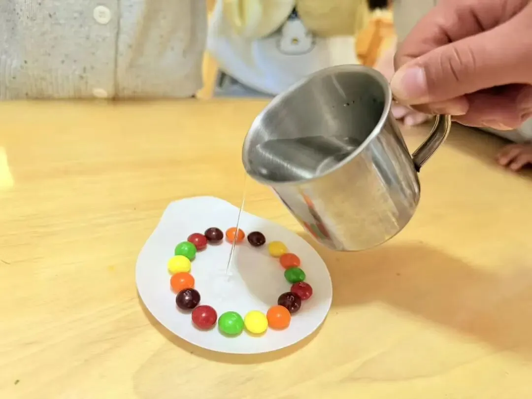 准备一盘彩虹糖,围成一圈,中间慢慢倒上温水… 接下来就是见证奇迹的时刻!
