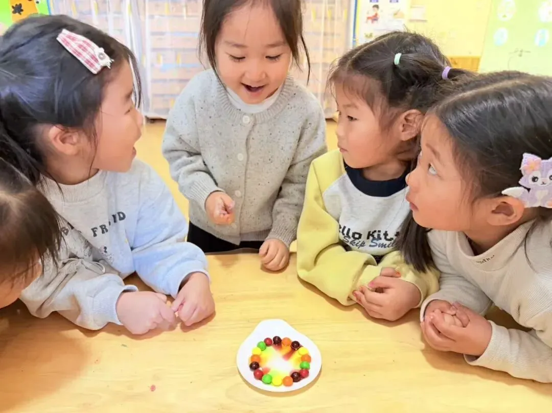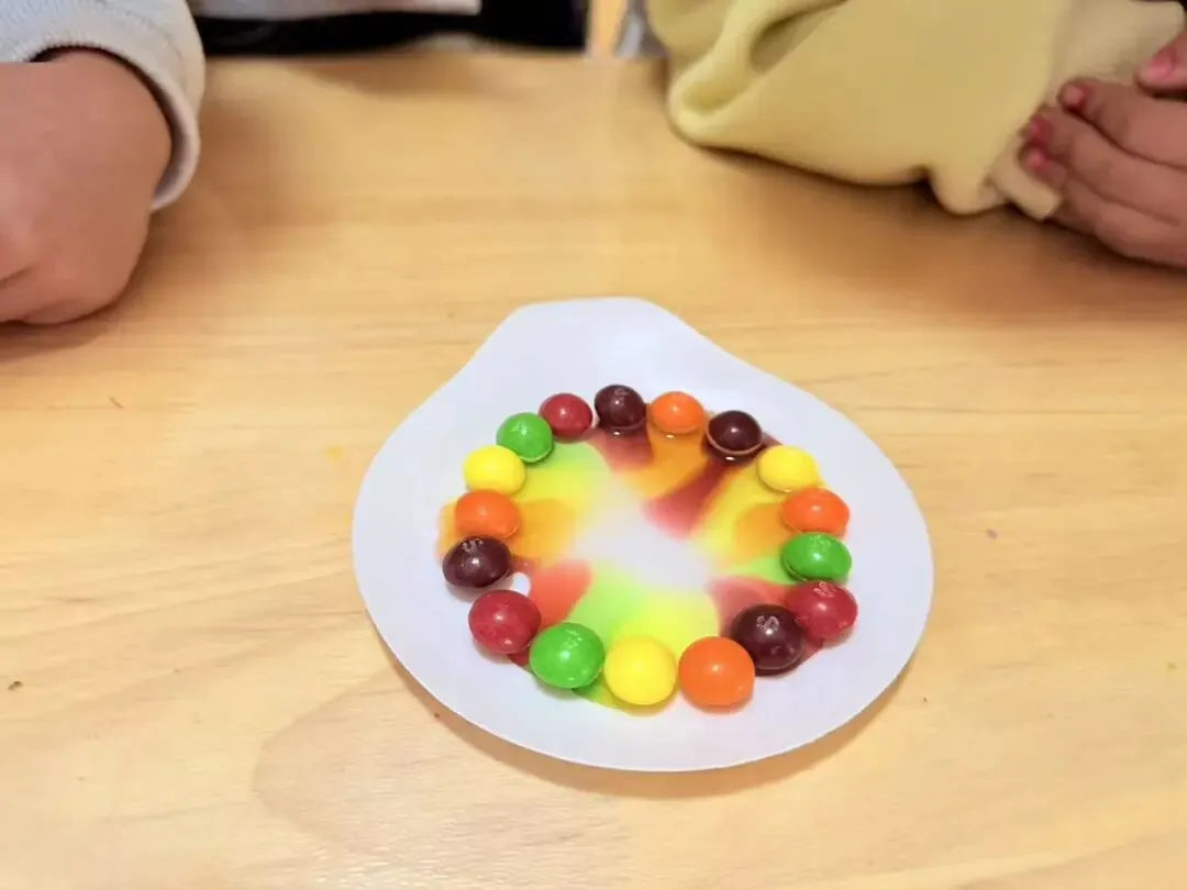 通过这个简单的实验,可以直观地观察到溶解和扩散的物理现象,同时也展示了密度差异对色彩扩散的影响,形成一个既美观又富有教育意义的图案。让小朋友们在欢快的氛围中,通过亲自动手做出美丽的彩虹。