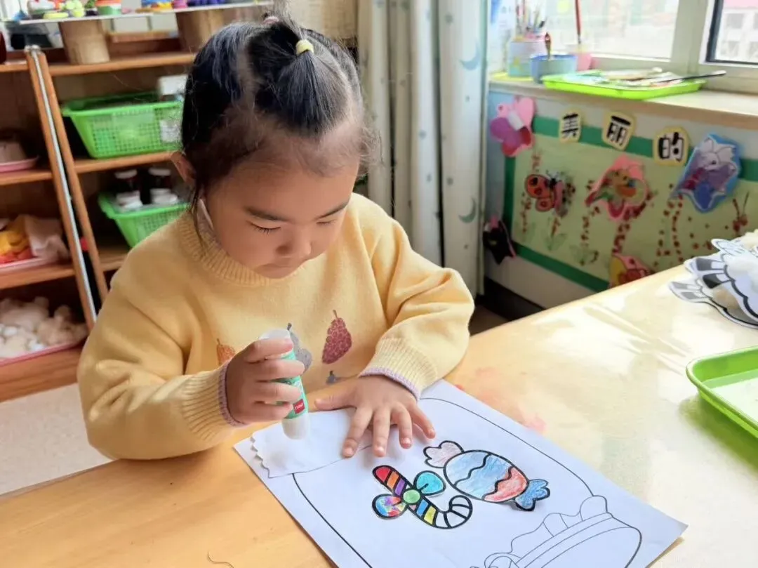 本次活动将幼儿喜欢的糖果融入到教学中,激发了幼儿兴趣的同时,提升了幼儿的动手能力,锻炼了手部肌肉群的发展,幼儿初步探索不同颜色组合产生的美感,为以后更加丰富的美术活动打下加基础。