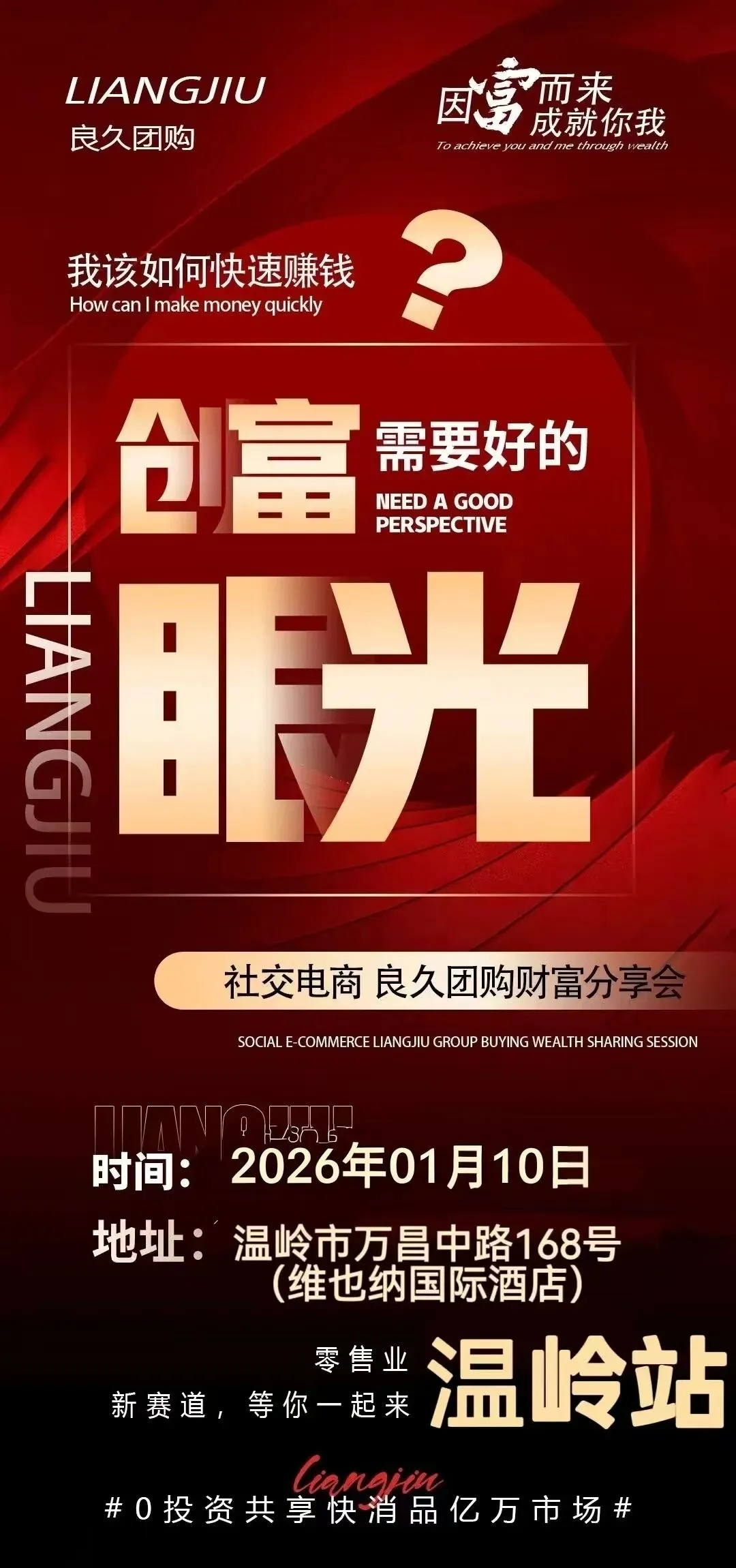 今天星期五,又到了周末。元旦小长假后连续上班的第六天,好多牛马们已经受不了了,打工人以分秒计时,多上班觉亏。摸鱼则例外,那等于赚。我则不然,因为已经开启着创业模式。时间观念已经与过往不同。没有人买我的时间,但我仍然要将时间价值无限放大。通俗地说,就是减少或杜绝无效社交,在单位时间里干尽可能有用的事情。干点什么呢?当然离不开目前、当下最重要的良久事业。早上听晨会,主题是陈明华医生的分享,《营养治疗一糖尿病康复的曙光》。陈明华中批发是静董团队甚至良久系统里知名专家之一。他是科班出身,研究生毕业,中医主任医师,特别能身体力行的营养学专家。我曾经在多个场合听过他的演讲,受益颇多。大健康是良久产品系统里非常重要的三大业务板块之一,有医学背景又懂营养学,专业又权威,不当销冠简直说不过去。良久另外还有日用刚需和酒水板块,里面也都有非常牛X的销售高手。说良久藏龙卧虎,一点都不夸张。陈医生的分享是建立在越来越多的成功病例基础之上的。在良久,讲营养六粉,讲一款款健康团品,当且仅当,惟有靠谱的真实的疗效,才能吸引更多的朋友试用到笃信,成为忠实的粉丝,顾客,代理。每在的晨会结束时间是九点左右。而我所乘坐的楼巴也是在这一时刻从C区香山湖交通中心开出,旋即上增天高速,28分钟后到达广州天河市区,下高速后的第一站是中山大道路口,第二站的华师南门。我今天是在岗顶地铁站下的车。今天先不回国学院,要在地中海酒店“练摊”。约了房地产圈里的旧同事,在珠光旗下的这间酒店大堂,做招商咨询。不过今天的主角不是良久,是房地产业务。珠光目前还有金融城壹号和海珠新城在销售,两个易拉宝分别放置在摊位两边。我朋友九点就上了岗,我则在十点半左右才到达指定的位置。这里我并不陌生,酒店商业部分是南方电脑城的场所,之前经常来的。岗顶这块,熟得不能再熟了。看到摊位冷冷清清的,同事在看书。我即刻决定返国学院,拿来烧水壶、茶壶、茶杯、茶叶等全套东西,在隔壁便利店买了桶水,泡茶喝。我将现场拍照发到老友群里,吸引了海哥也过来。一块聊。时间才过得快些。闲聊中,仍然奋战在地产销售一线的这位旧同事,以及脱离地产已经许多年许多年的海哥,都对地产的前景,2026年的行情,非常不看好。我有不同看法,但也不便说出,争论无益,有伤和气。干脆绕开这个话题,聊聊天气,聊聊吃喝,呵呵。海哥前些日子偶然发现我在写公众号,很受刺激,这几天也兴冲冲地干起来。我看到他已经以创业为主题,连续发了好几篇,效果还不错。我说,咱们就相互监督,激励,千万千万不能虎头蛇尾,一定要坚持,见效果。说起对房地产的看法,我的思绪一下子又拉回到下了楼巴在天河吃早餐的情景。北京的资深媒体人李海燕说,写写郁亮,赶紧。我说,晚上回去吧,没带电脑,在外面摆摊呢。她说好。她是个急性子,我知道她等不到我晚上回去按部就班的写。一个小时不到,她已经把自己的大作推送给了我。是发在公众号“环环看趋势”里的文章《郁亮安全下车?》,我快速读完,确实厉害。快枪手。写不了,只能留言。我的留言是,王石离婚与郁亮退休,时间点怎么就这么碰巧呢?许多人都知道文章说什么,留言说什么。但话又不能说得太白,太死。对于房地产,我以及我身边的旧同事,都是既爱又恨。一个行业一家公司干了十几年,红利没吃多少,日子过得倒是滋润的。现在,地产这样,我的同事中,主动走出来换赛道的有,被动走出来仓促找份工作的有,像我这样,从地产到建工,节节败退,最后终于也走上了社群团购的路。如果,如果房地产没有现在的现状,我会干良久吗?答案是否定的。人总是会在舒适区里打转,不到万不得已,不会主动砸自己的饭碗。可现实生活中是没有那么多如果的,只有结果。现在,已经在良久奋战八月有多,我相信时间的积累,复利的力量,能够达成自己的目标,前提是,不能下车,一定不能提前下车。下午闲聊中,我的良久的同行朋友都在一心一意卖货招商。想想都羞愧难当。看到韦淮老师在超市里分享活川低氘水,信息量好大,知识点好多,后来,她又在下午五点开了直播,将刚刚学到的知识分享出来。20多分钟的直播,后半段直播间里0人,她对着空气讲完。真心让人佩服。我是在回到国学院的时候听完她的直播回放的。确实讲的不错。她说,学到的东西,只有自己讲一遍,才算掌握。所以,直播间里即使是没有一个人,对着空气讲一遍,收获还是自己的。这一点,我更相信输出的力量。就像我现在每天坚持写创业日记一样。明天,艳华老师组织的内训会招商会又要开了,这次是在浙江台州的温岭。看到海报,中批发矩阵好强大,台州的市场做得真不错。可惜太远,要不我又要忍不住去借势借能量了。做良久必须上团队,一个人毕竟能量弱,做着做着容易偃旗息鼓,只有建立起团队,一帮志同道合的朋友一起干,才会拿到大结果。而我现在写公众号,天天坚持,不正是在吸引我的团队伙伴吗?期待看到我文字的陌生朋友,能同频共振,一起干。我干良久是打持久战的,不是一两年的投机,想干的跟着我,不会让你们失望的。收到我的感召了吗?~~~~~~~~~~~~~~~~