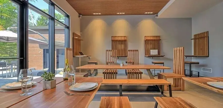 度假别墅内部装修现代典雅,采用木质装饰,与大自然合为一体,宽大的玻璃窗及推拉门让室内采光明亮。透过玻璃窗您便能欣赏到大自然的美!楼内分为三层,室内空间宽敞,阳台可以感受自然风光,大露台上可以聚会烧烤,不仅适合与家人一起出行放松,也可以邀请朋友一起小聚,是远离城市喧嚣,休闲放松的完美居所。