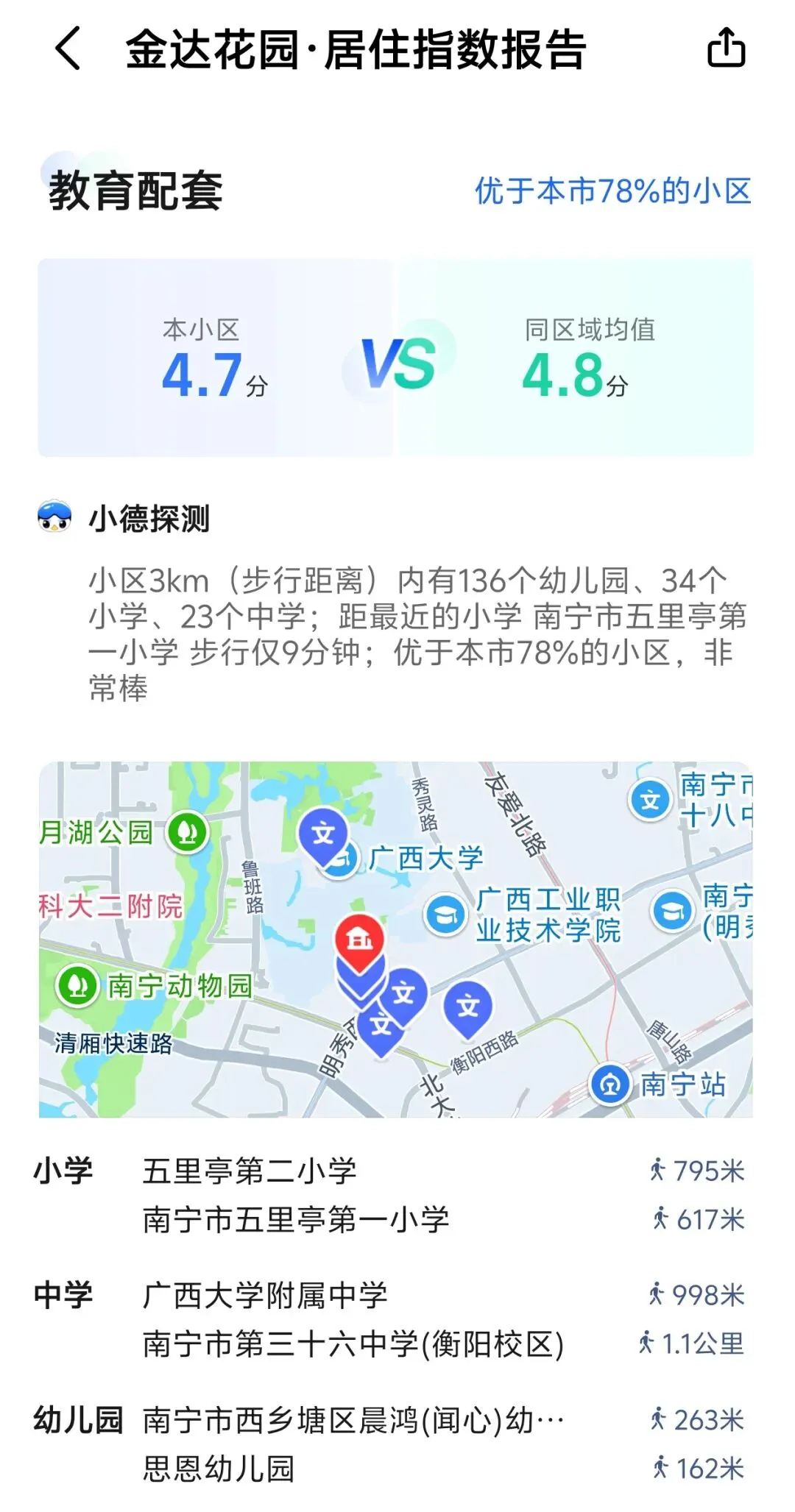 “昔孟母,择邻处。”古有孟母三迁,为的就是给孩子一个更好的成长环境。而在金达花园,你无需奔波换房,优质教育资源就在家门口。小区周边坐拥多所幼儿园、小学(含南宁市五里亭第一小学)、中学(含广西大学附属中学),更紧邻广西大学等高校,学术氛围浓厚,租客需求稳定。