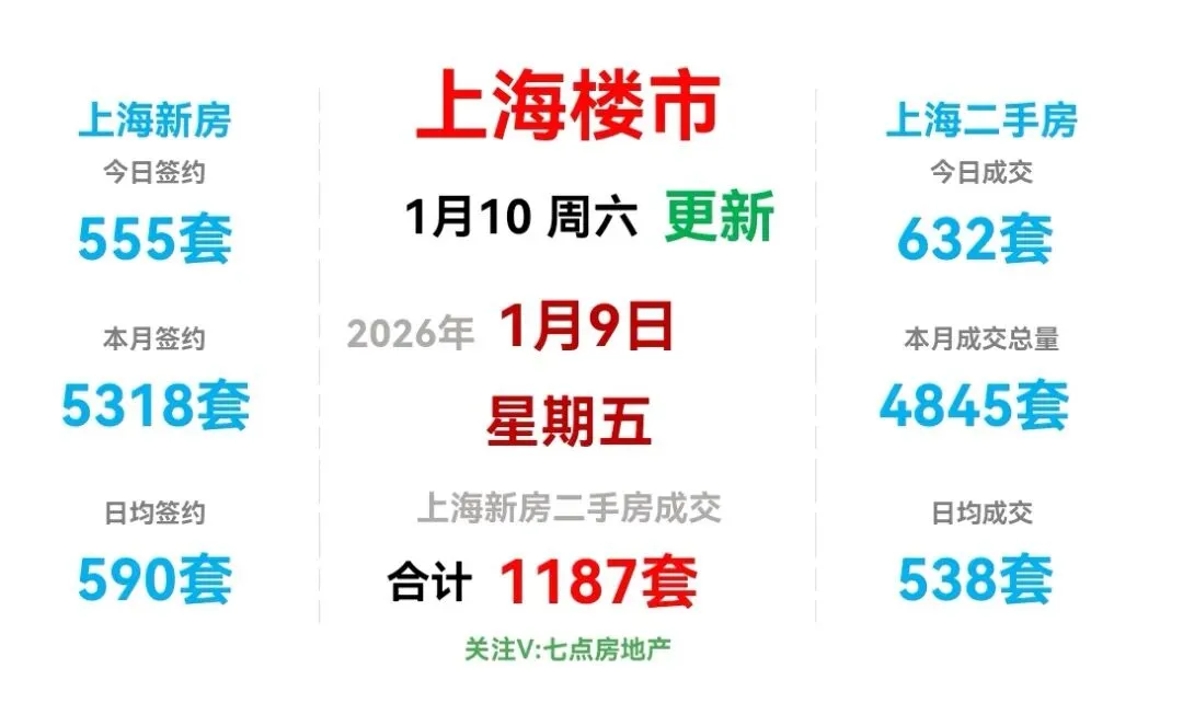 昨日(1月9日,周五),上海新房和上海二手房成交量合计1187套。