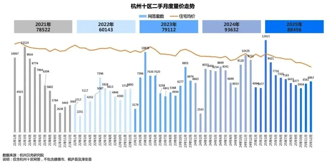 2025年的杭州二手房市场是一个典型的“以价换量”的年份。据杭州贝壳研究院数据,全年杭州二手房成交了88456套,虽然比2024年的9.36万套有所下降,但仍高于2021、2022和2023年的水平,是近五年来的第二高位。而杭州二手房网签均价却从高峰时期的约3.5万元/平方米跌至26832元/平方米,部分板块甚至出现 10%-20%的价格回调。