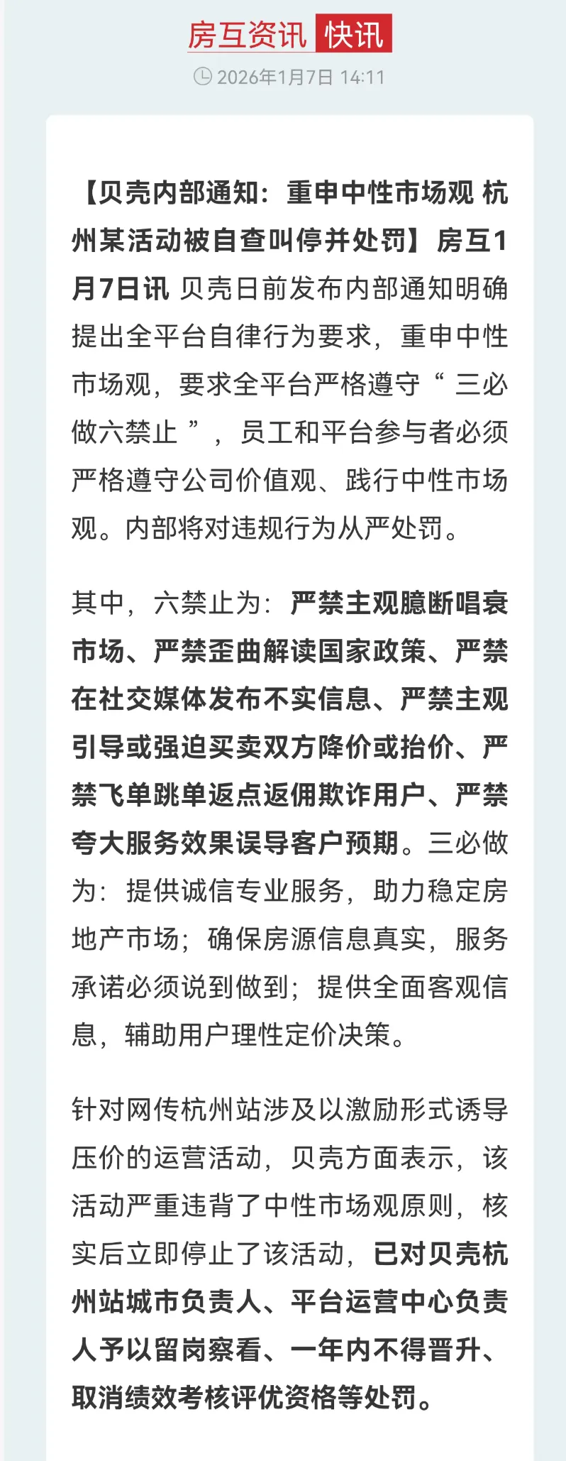 贝壳在内部通知中重申“中性市场观”,明确“六禁止”中“严禁主观引导或强迫买卖双方降价或抬价”的要求,同时提出“三必做”的服务准则,正是对行业初心的回归。