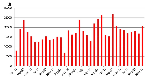 2025年二手住宅市场呈现量增价跌走势。年初虽然是传统淡季,但是承接去年末一系列政策利好,淡季不淡,成交量都在1.5万套/月以上。此后小阳春表现抢眼,3月成交2.69万套,创下45个月以来单月新高。此后成交一路走低,虽然8月有楼市利好政策,但“金九”成色严重不足。不过年末成交再度放量,翘尾收官。累计到11月,二手住宅20.67万套。按照12月的成交情况来看,依旧有达到2万套的可能。预计全年成交有望达到22万套,优于去年。