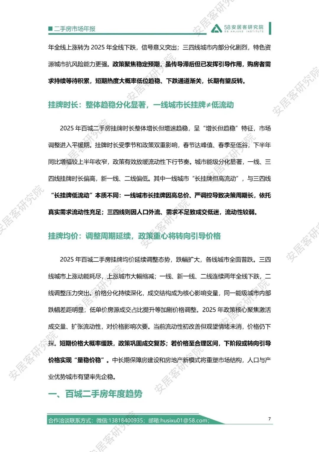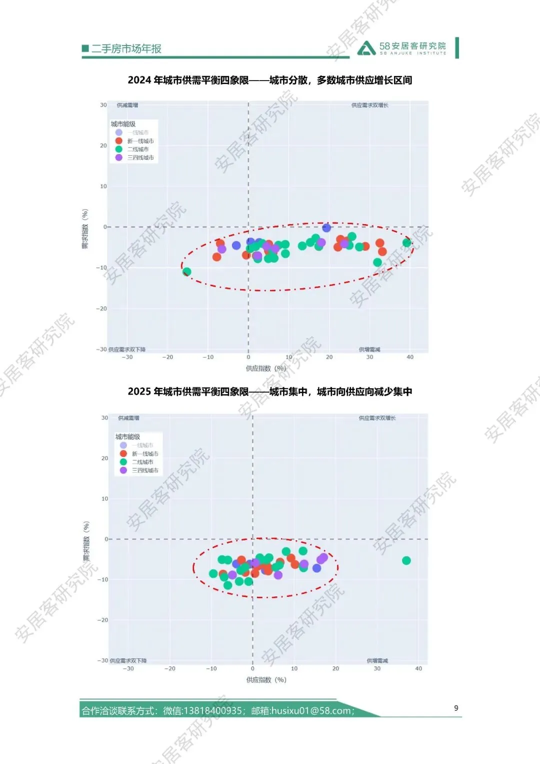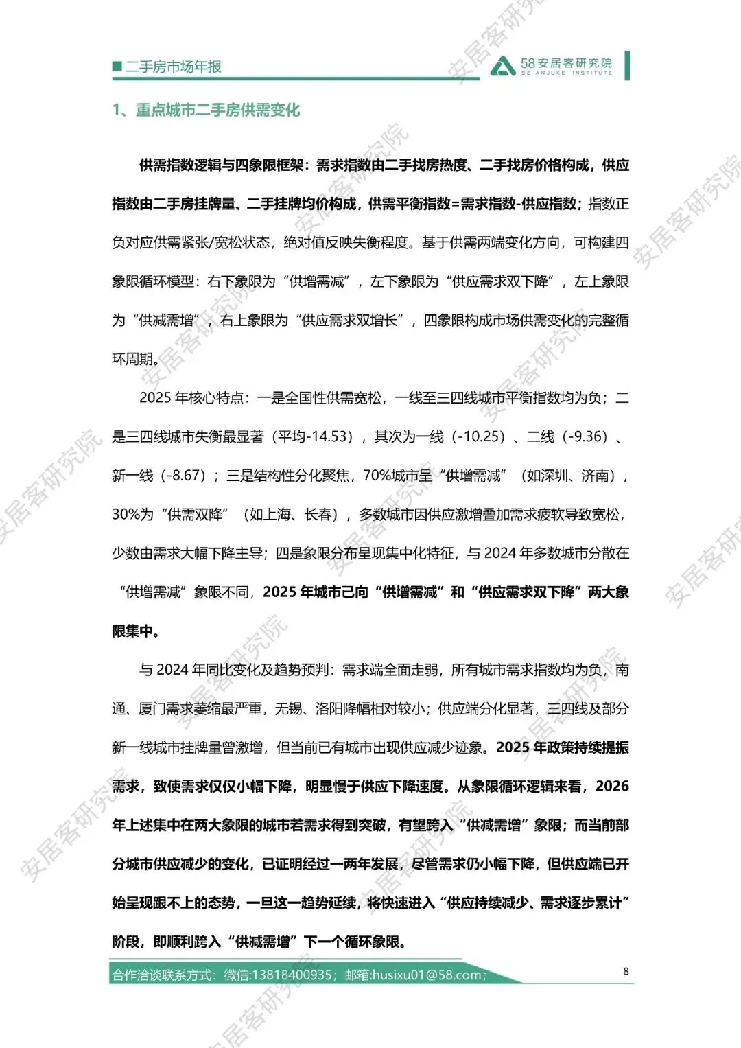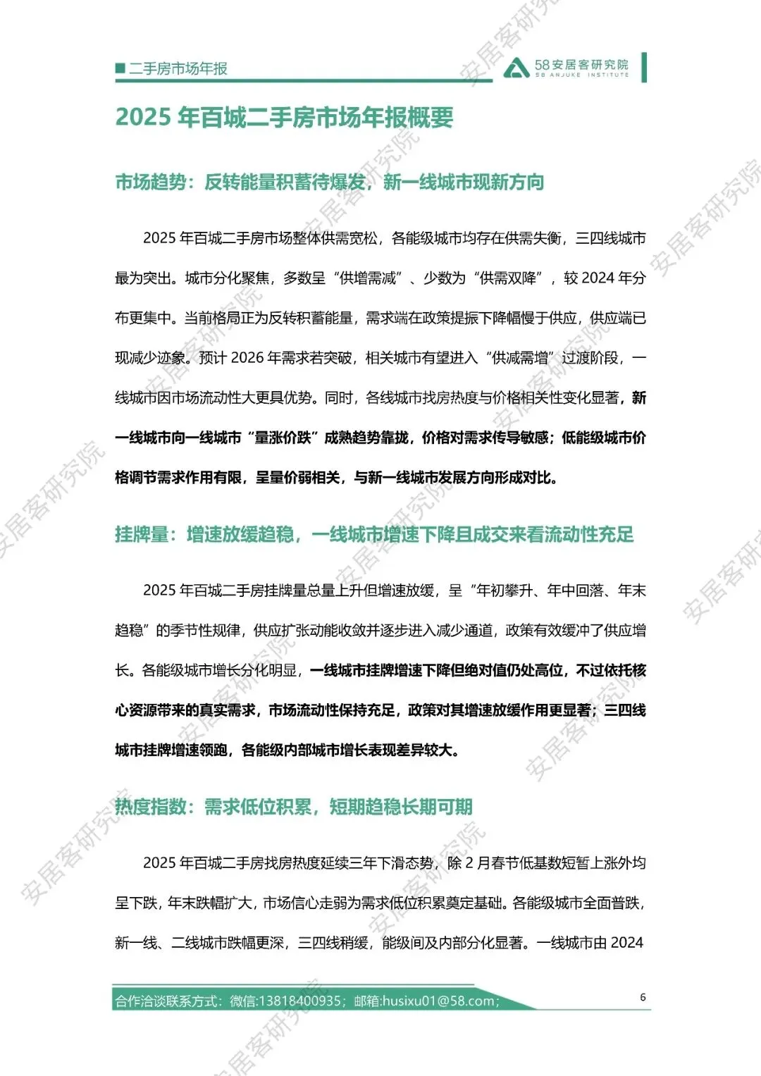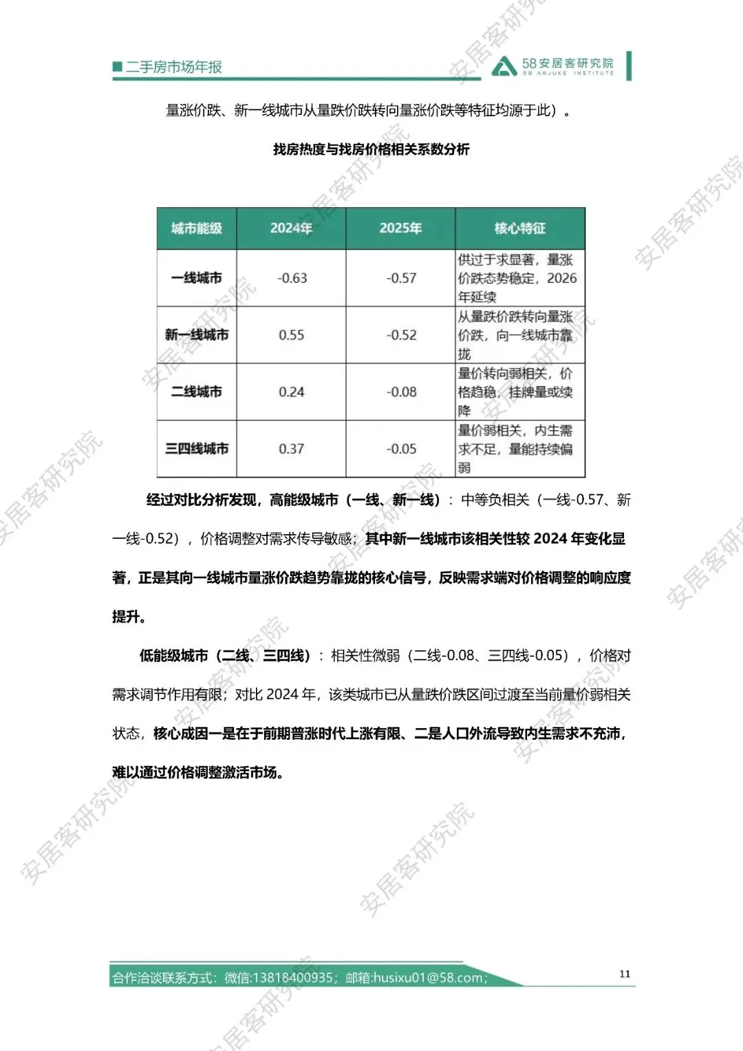 2025年百城二手房市场整体供需宽松,各能级城市均存在供需失衡,三四线城市最为突出。城市分化聚焦,多数量"供增需减"、少数为"供需双又降",较2024年分布更集中。当前格局正为反转积蓄能量,需求端在政策提振下降幅福慢于供应,供应端已现减少迹象,预计2026年需求若突破,相关城市有望进入"供减需增 过渡阶段,一线城市因市场流动性大更具优势。同时,各线城市找房热度与价格相关性变化显著,新一线城市向一线城市"量涨价跌"成熟趋势靠拢,价格对需求传导敏感:低能级城市价格调节需求作用有限,呈量价弱相关,与新一线城市发展方向形成对比.