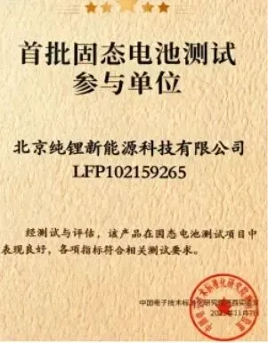 【固态电池:纯锂固态电池产品LFP102159265获产品认证】2025年11月07日,北京纯锂新能源科技有限公司研发的基于创新的固态电解质材料和电池结构设计固态电池产品LFP102159265,在绿色电池评价分析工业和信息化部重点实验室(依托赛西实验室建设)组织的首批固态电池权威测评中表现卓越,顺利通过全部测试项目,荣获产品认证。过充安全:4V以上恒压过充7小时,无起火、无爆炸;热滥用安全:140℃热箱30min,无起火、无爆炸;针刺安全:5mm钢针刺穿保持1h,无起火、无爆炸。