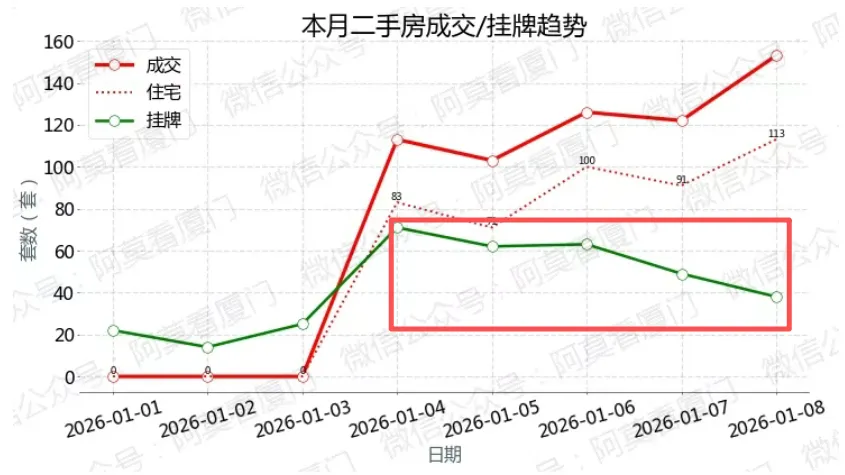 元旦节后,厦门二手房(仅统计住宅)持续放量,连续多天成交量破90套,截至1月9日二手住宅总成交量已经达到573套,日均达到64套,若扣除元旦假期,日均二手住宅成交量达到95套。不少读者朋友可能对于日均达到95套没有什么概念,作为长期在地产一线的云哥明确告诉大家:如果日均成交量在80套以上,说明市场已经非常活跃,如果日均成交量达到90~100,说明市场已经非常火热了,相反如果日均成交在50及以下则说明市场比较平淡大家只要对比一下2024年厦门二手房的成交量,就会有非常明确的理解。此外,我们再对比一下12月份的行情,整个12月二手房成交1835套,日均59套,如果对比同期12月初,明显发现日均成交量提升了近50%以上(扣除节假日后)同时我们也可以看到从12月19日以后,厦门二手房的成交量慢慢有所回升,1月的表现并非突如其来,看起来更像是12月行情的延续。第一点也是目前的主流观点,那就是市场以价换量结果,不少房东恐慌性抛售,以远低于市场行情价在跑量,特别是一些低成交量的区域,无论房东还是买家对于行情价都没有特别清晰的认知,同时有部分从业者为了早日成交往往会拿大刀PUA房东。第二点则是近期救市预期越来越强,全国层面及各地方层面各种救市的小作文及实质性的动作均有在出台,这也让一些原本就不坚定的房东当初急于卖房的心态开始动摇。根据阿菲看厦门的数据,二手房挂牌量近期与二手住宅成交量开始出现背离,这在此前是比较少有的。在二手房成交量低估的2025年10月份,我们可以看得出来,二手房挂牌量基本上会高于或者是与二手住宅成交量接近。这也是为什么云哥一直认为二手房比一手房更能反映市场真实情况的原因。第三点那就是对于房地产自媒体进行管控,虽然厦门还没有出台相关举措(有传言近期会出台),但是上海、北京、深圳等地已经出手管控,在这种预期之下,厦门过往大力唱衰和唱空的声音小了很多,也少了很多,这也为最近的成交提供了舆论环境。一方面急售的房东少了,一方面敢于出手的客户多了,两方面共同作用之下 便有了这一波行情。对于楼市舆论的管控至关重要,而不是不少人嘲讽的捂嘴,这完全是低估也不了解舆论的力量有多大。不少自媒体把房子当股票操作,追涨杀跌,大多数更是后视镜视角,指导大家高抛低吸,做T,但实际上基本都是在低谷期大肆唱空叫人卖房,在高点火器又大肆唱多让人接盘。