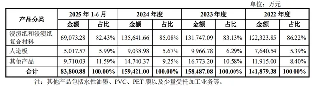公司主营业务收入主要来自浸渍纸和浸渍纸复合材料,报告期内浸渍纸和浸渍纸复合材料收入占主营业务收入的比重分别为 86.22%、83.13%、85.08%及 82.43%。