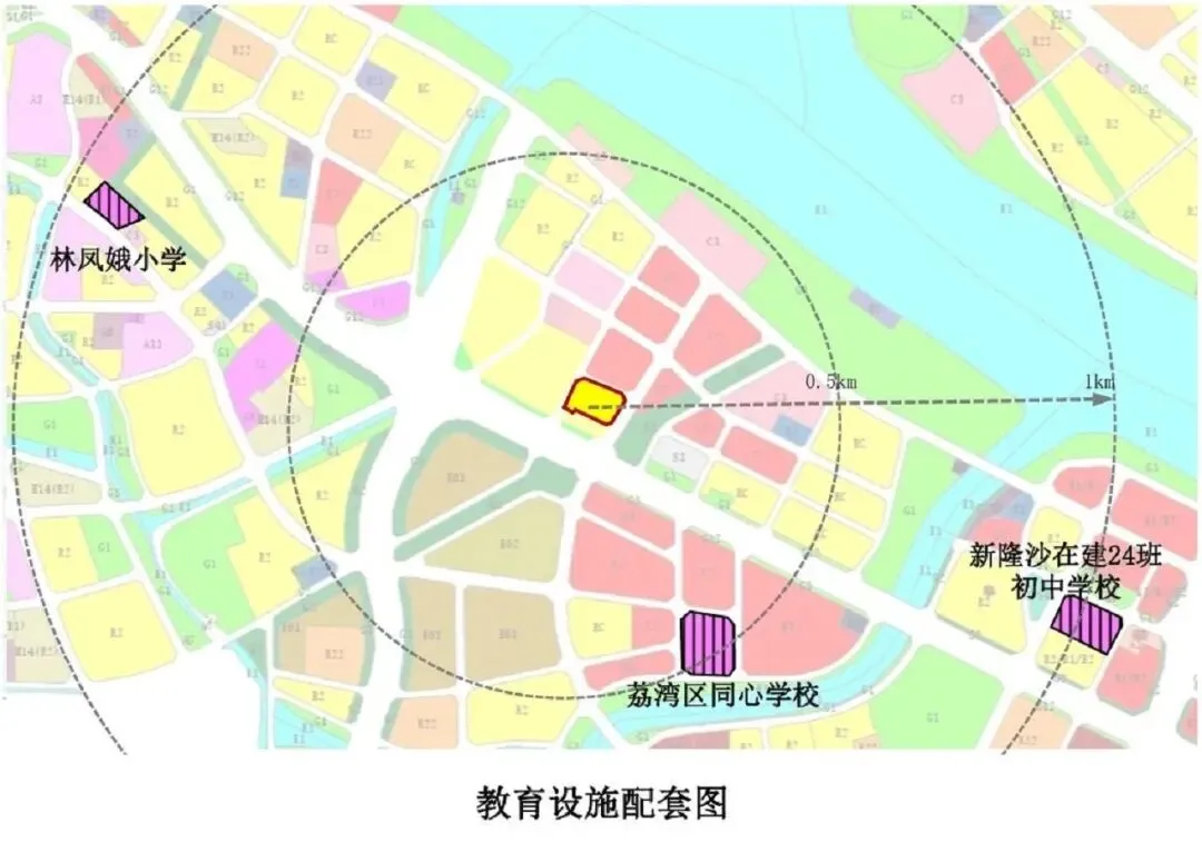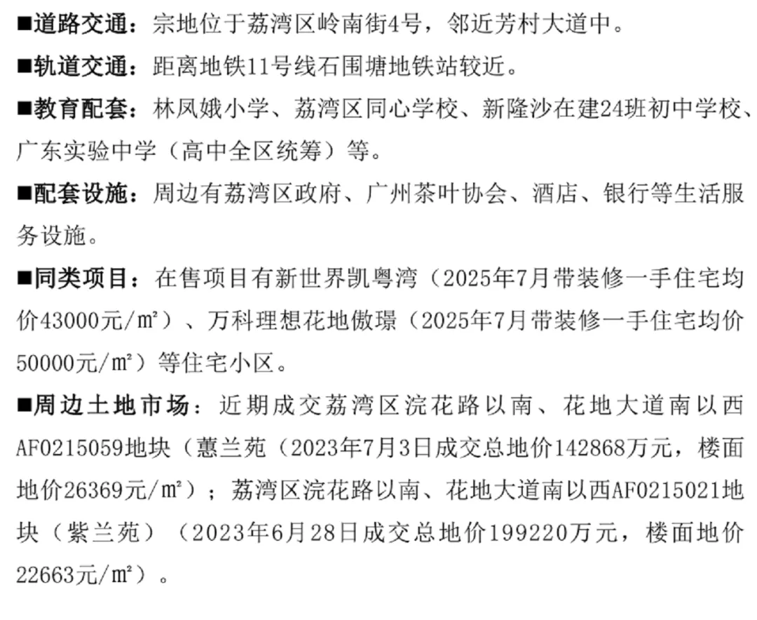 该地块紧邻广州地铁11号线石围塘站,交通便捷度是该地块的一大优势。距离白鹅潭万象城(预计2026年开业)、大湾区文化艺术中心约1-2公里;教育配套,地块周边有林凤娥小学、荔湾区同心学校、新隆沙在建24班初中学校、广东实验中学(高中全区统筹)等。