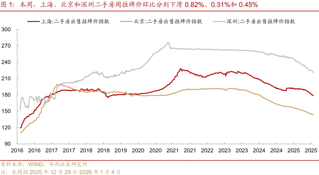 各线城市延续磨底态势,二线同比调整压力最大。本周(2025年12月29日-2026年1月4日),各能级城市挂牌价延续小幅下跌走势,环比跌幅主要集中在0.29%-0.53%区间。同比维度看,二线城市回撤幅度最大,同比跌8.69%;一线及三线城市同比跌幅分别为6.81%和7.19%。