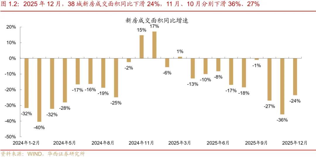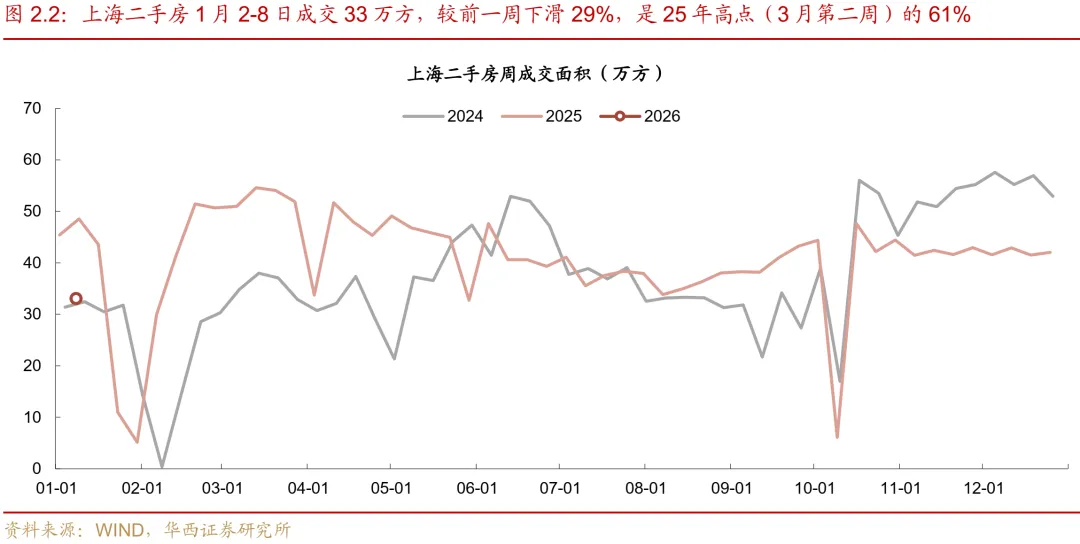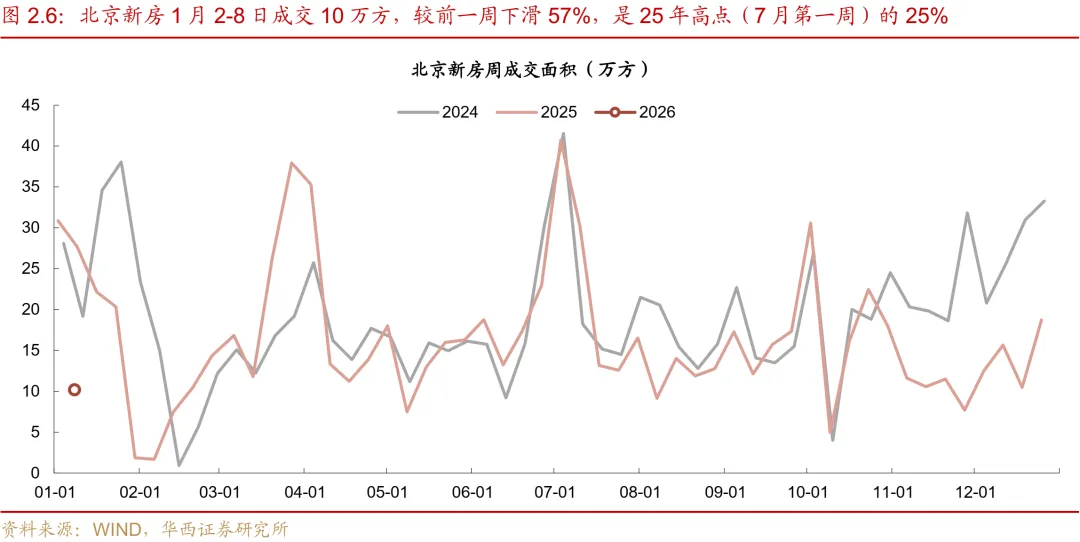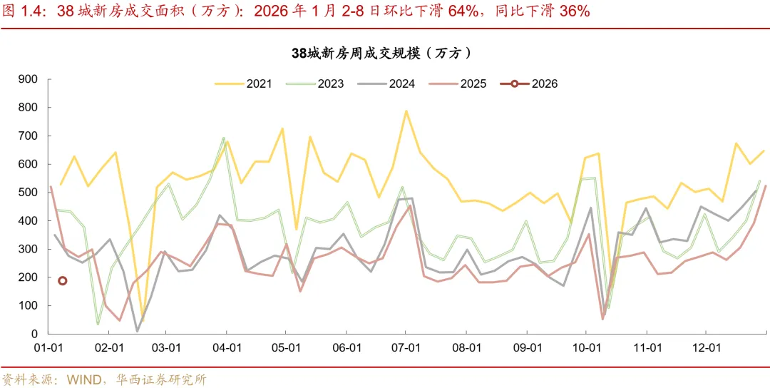 受年末冲量高基数影响,新房成交环比大幅回落。受2025年末房企集中推盘及业绩冲刺结束影响,本周38城新房成交面积录得188万平,环比下滑64%。同比来看,较2025年元旦后首周(295万平)下滑36%,降幅较12月(-24%)有所扩大,且已连续十五周呈现同比负增长态势。