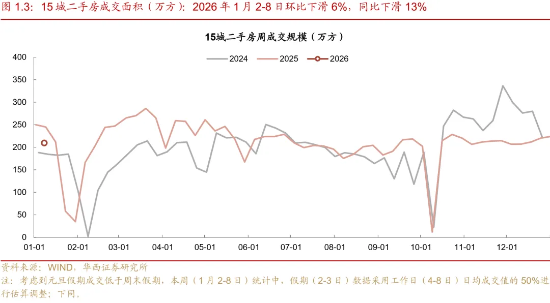 注:考虑到元旦假期成交低于周末假期,本周(1月2-8日)统计中,假期(2-3日)数据采用工作日(4-8日)日均成交值的50%进行估算调整。