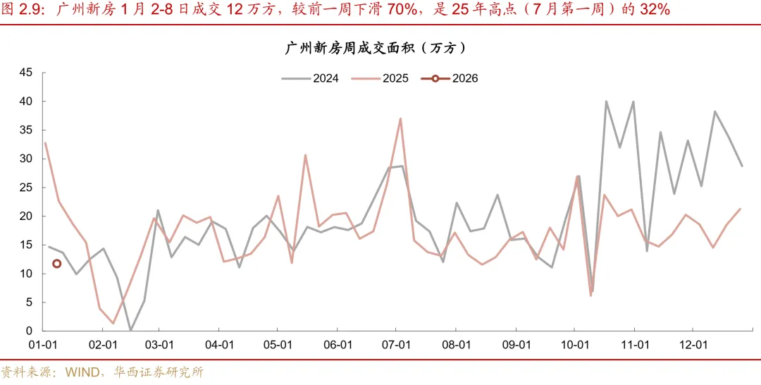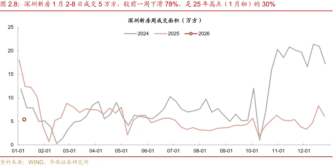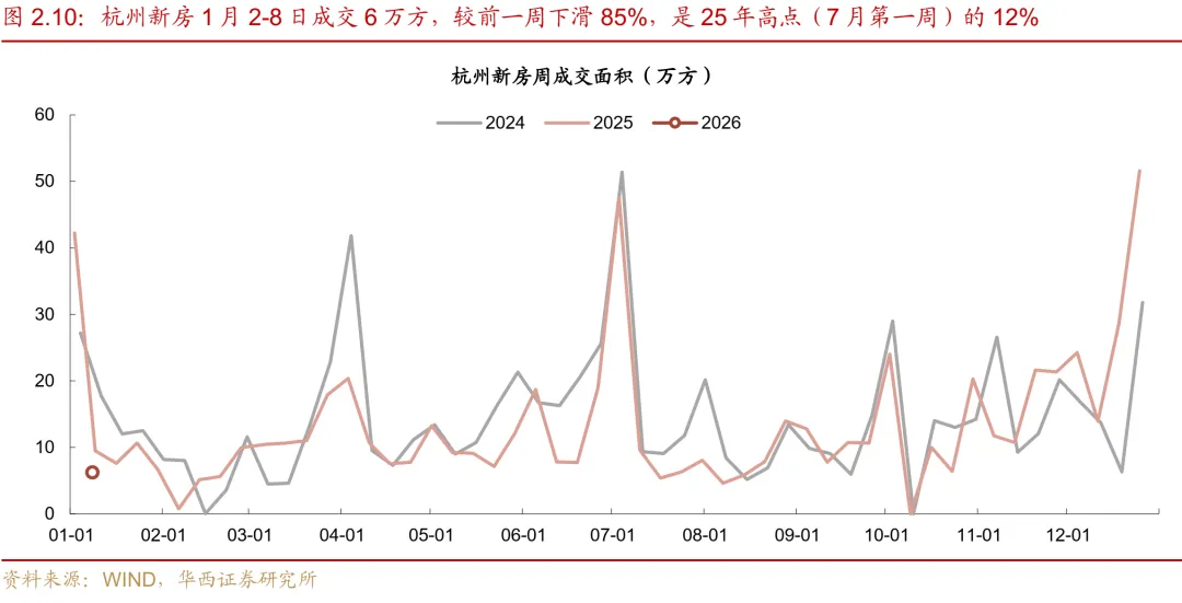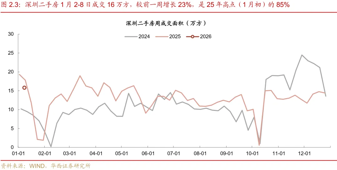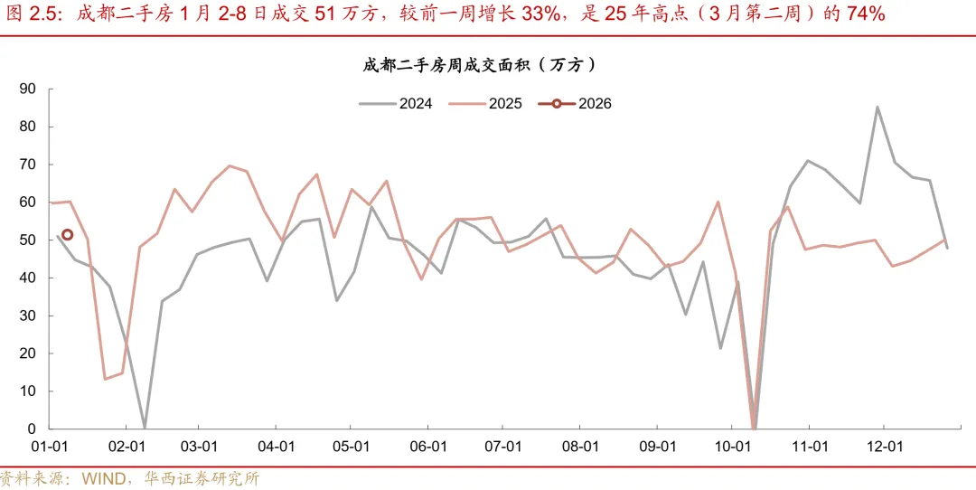二线城市新房与二手房成交走势背离,二手房显著回暖。新房方面,受年末冲量高基数影响,成交环比大幅回落。本周二线城市新房成交环比下滑68%。同比来看,降幅达34%。分城市看,部分核心二线城市回调明显,杭州、武汉环比分别下跌85%和93%。二手房方面,市场表现优于新房,成交环比逆势增长。二线城市二手房成交环比录得32%的增幅,同比降幅收窄至10%。其中,苏州表现最为亮眼,环比大幅增长80%,青岛、成都、厦门增幅也保持在22-33%区间,显示出较强的韧性。