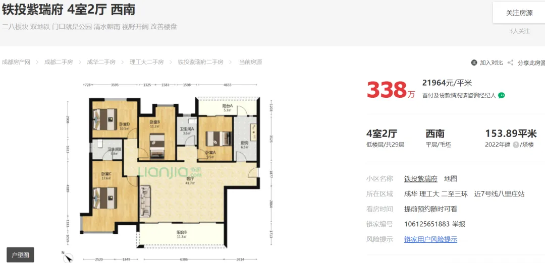2026年01月02日,【那坊归心】成都成华万年场存量房(二手房)合信滨河壹号院建面121平套四报价378万,是否适合90后?