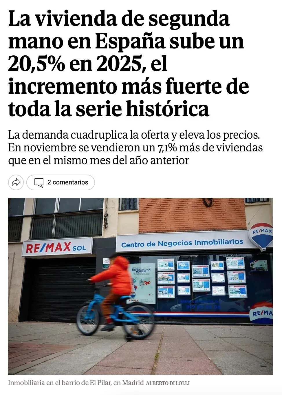 2026年1月8日,西班牙头部租房网站图家(Fotocasa)发布的《2025年二手房市场》报告证实。西国二手房价格在2025年末实现了20.5%的年增长率,创下历史新高,12月达到每平方米2879欧元。