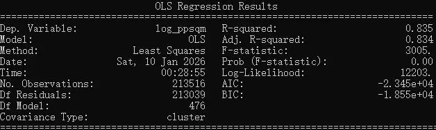 右侧的因变量是二手房成交时的每平米成交价。左侧的自变量的部分,age代表房龄,area代表房屋面积(单位:平方米)的对数,floor代表公寓所在的楼侧,C(layout)代表房型,C(location)代表地段,C(sale_yyyymm)则表示成交年月。C表示分类用的非连续变量。如此一来,从房龄到房型的变量控制了房屋的建筑属性,地段变量控制了环境属性,成交年月的变量则控制了外部经济形势,价值评价的2个层次得到了完整的体现。