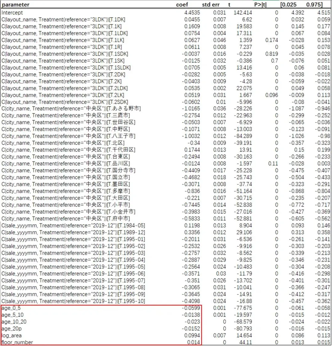 以下是回归得到的结果及系数。本文并非专业论文,也不以学术为目的,因此仅截取部分结果以做展示。以下也不会对回归得到的p值等做分析。以下图中红框处为房龄、楼层、面积,3个房屋本身属性的回归系数。(有兴趣的朋友们可以后台留言或者评论区见)