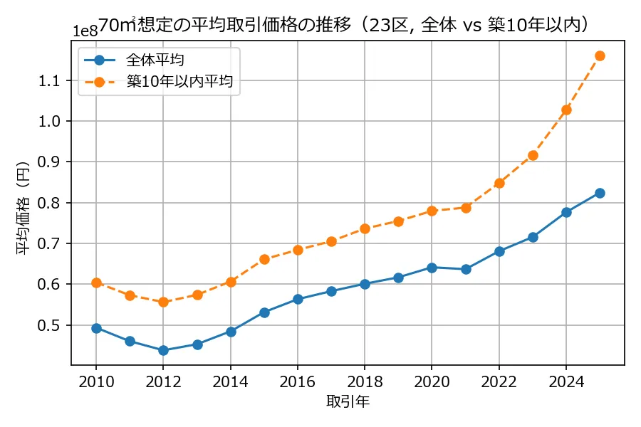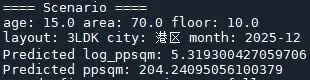 假设我们在2025年12月的时间点想考察一套位于港区的10楼的15年房龄的70平米的3LDK的公寓。将这些条件输入我们的模型,