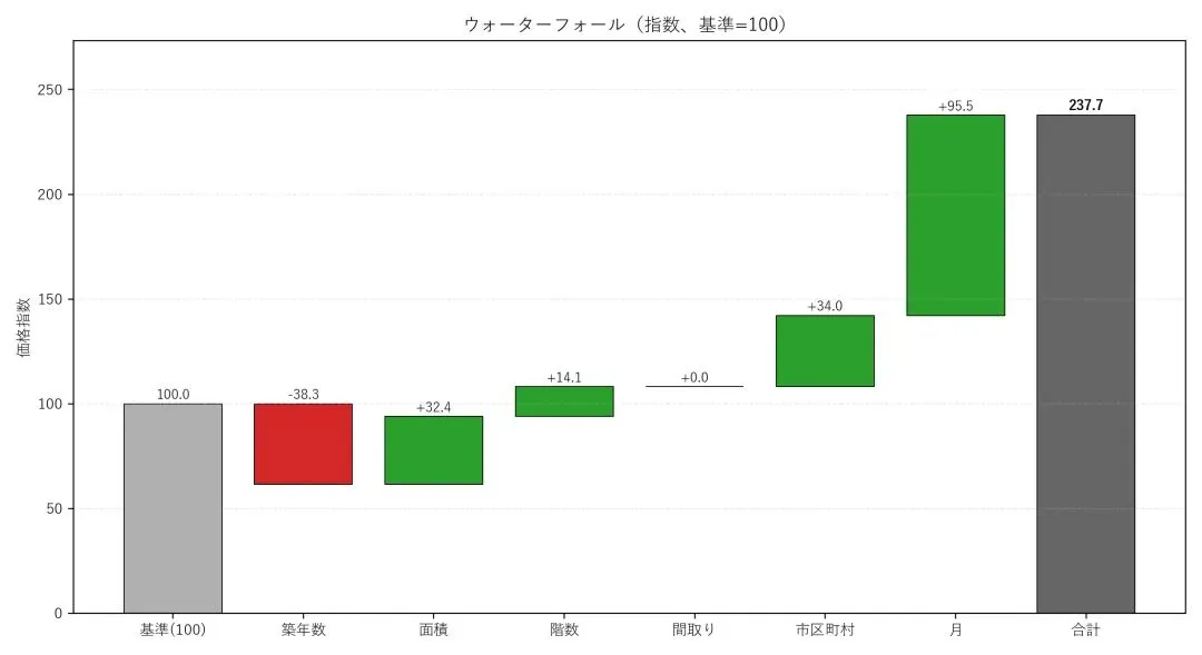 更进一步,通过这个模型我们还能知道,目标标的的价格到底“贵”在哪。以下是本案例中房产的溢价构成图。可以看到,目标标的的价格是模型的对照标的(如上文所述,是2019年12月出售的位于中央区的楼层为0层的3LDK面积为0的公寓)的237.7%,翻了1倍不止。其中时间效应,也就是2025年底和2019年底之间的日本经济状况的差异带来的增益最大,解释了溢价的70%。港区相对中央区的地段优势则能够解释25%的溢价。而15年的房龄给房屋带来的折价则几乎接近40%。