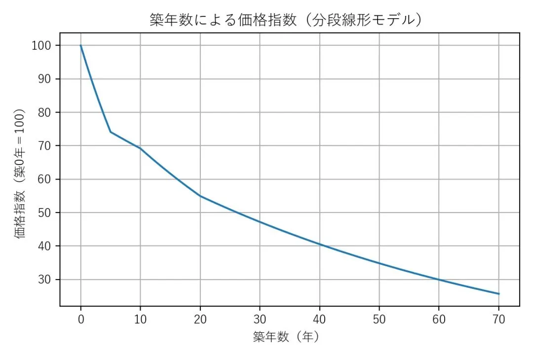 下图是根据回归得到的房龄-折价系数所做的模拟折旧图。可以看到,房屋的折旧速度在0-5年时最快,5年大致折旧27%。此后的折旧速度几乎保持一致。房龄5-10年、10-20年以及大于20年的折旧速度没有明显区别。到25年时,折旧达到一半。实际上,由于土地本身并不折旧,在土地私有的日本,不动产的折旧残值在根本上取决于土地的价值,并不会一直折旧到0。各个新建公寓在购入时,土地价值和房屋价值的比例不能一概而论,因此折旧速率也不可能完全相同。模拟图代表的是东京的一般情况。
