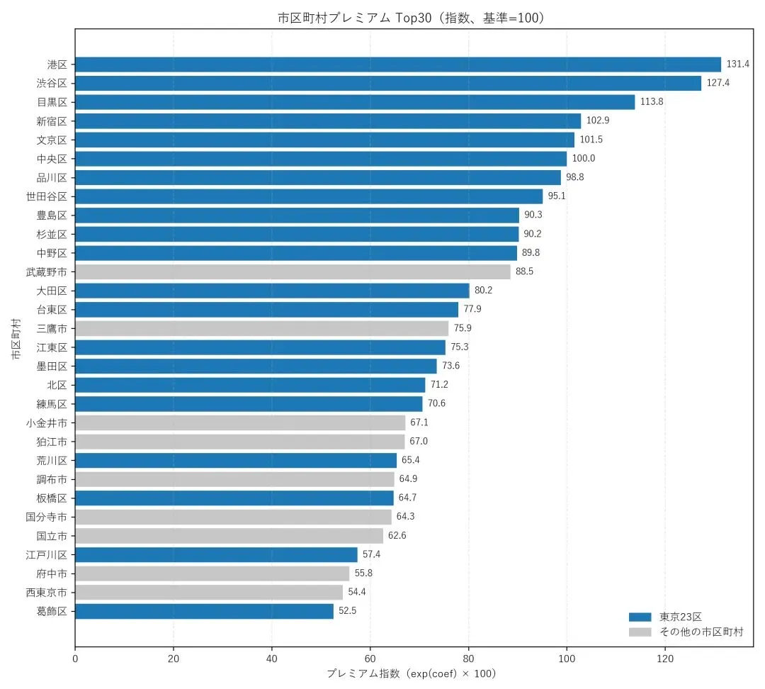 以上是与房屋本身属性相关的额外结论。使用回归得到的“地段”系数,我们还可与得到东京的各个行政区在排除房型区别的条件下,行政区本身带来的溢价多少。下图是东京都行政区的溢价排序(中央区作为对照区为100)。对比东京的行政区划地图,可以看到排序大致与本系列的上一篇,总览篇的结论是一致的,总体呈现西南高,东北低的特征。荒川区、江户川区等区,地段溢价甚至低于许多东京都西部的非23区的“都下”部分。实际上,东京都23区以外的部分并不能小觑。比如常年排名suumo调查的东京人最想居住的街区排名的前5位的吉祥寺就位于武藏野市。从吉祥寺坐电车前往涩谷或新宿仅需要约20分钟。
