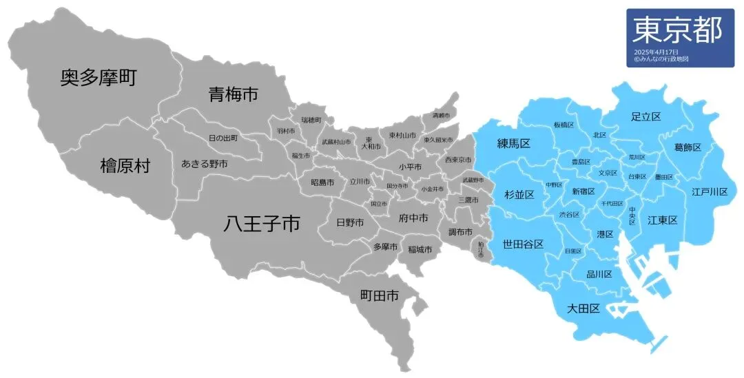 这里也简单介绍下东京都的行政区划。东京最早在日本的行政级别上并不像现在一样有特殊地位。在1943年撤府建都之前,东京同样是2级行政区划,现23区的部分受东京府东京市管辖,其余部分属于东京府。在1943年之后则统一受东京都管辖。23区被称为“都内”,23区以外称为“都下”。虽然现如今都受东京都管辖,但都内和都下仍然在行政上存在差异。东京的23区在行政上被称为特别区,其财政在东京都内部存在转移支付,避免出现都内财政差异过大的情况。都下的各个市则不参与转移支付。