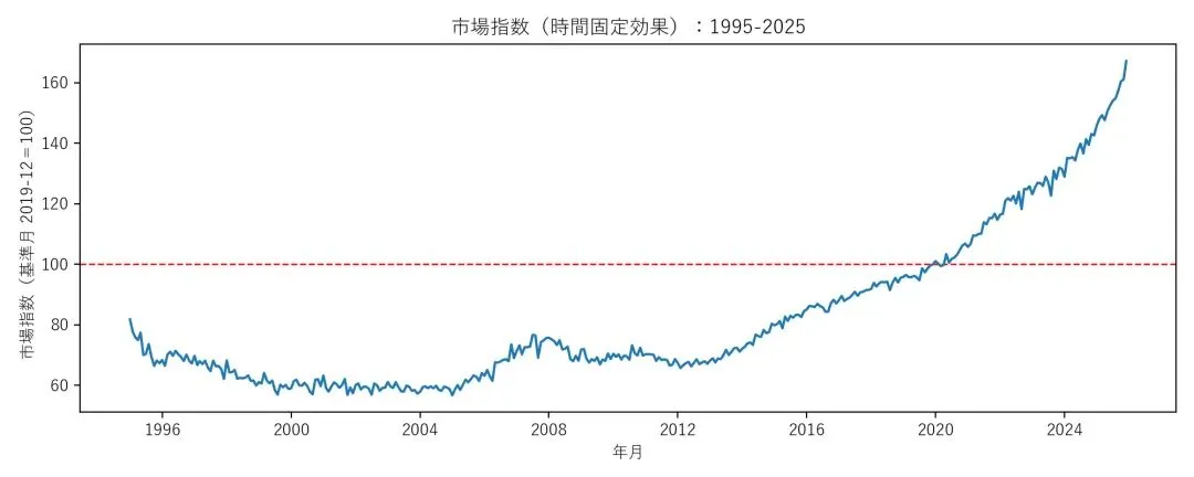 回到主题上,除了房屋的属性,通过“时间”系数,还可以分析排除了房屋本身差异的东京房地产市场的整体走势。下图是根据回归系数得到的东京房价走势图。观察走势,大致可以有以下几点发现。第一,日本的房地产泡沫破裂于1991年,在连续跌了4年之后,从1995年开始又再连续下跌了10年,一直到2005年才见底,期间一次像样的反弹都没有。第二,现如今东京房地产市场的牛市始于2012年后的安倍经济学。第三,东京的房市在2020年后经历了加速,2025年又再进一步加速。现在相比2012年时,价格已经翻倍,涨幅大致和东京225指数类似。(笔者认为,日本地产泡沫破裂后的走势可为国内投资者借鉴,是房地产市场是否跌到头的重要参考。)