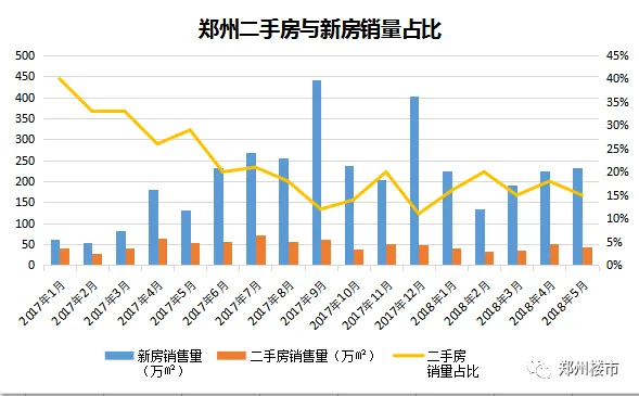 从2017年6月以来,郑州新房单月销量基本在200万㎡以上,二手房从2017年10月以来销量基本在50万㎡以下,销量明显下降。整个房地产市场上,二手房销量占比鲜少超过20%。