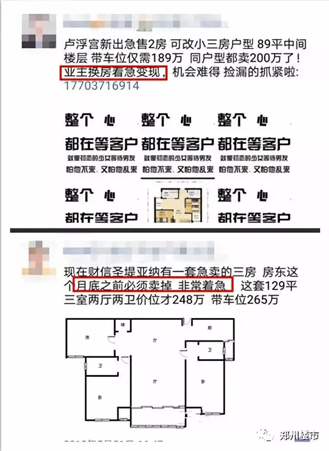 你看上图是不是似曾相识?这是近期朋友圈常态,中介们发布的房源消息中,“急售”、“降价卖”出现的频次最高。