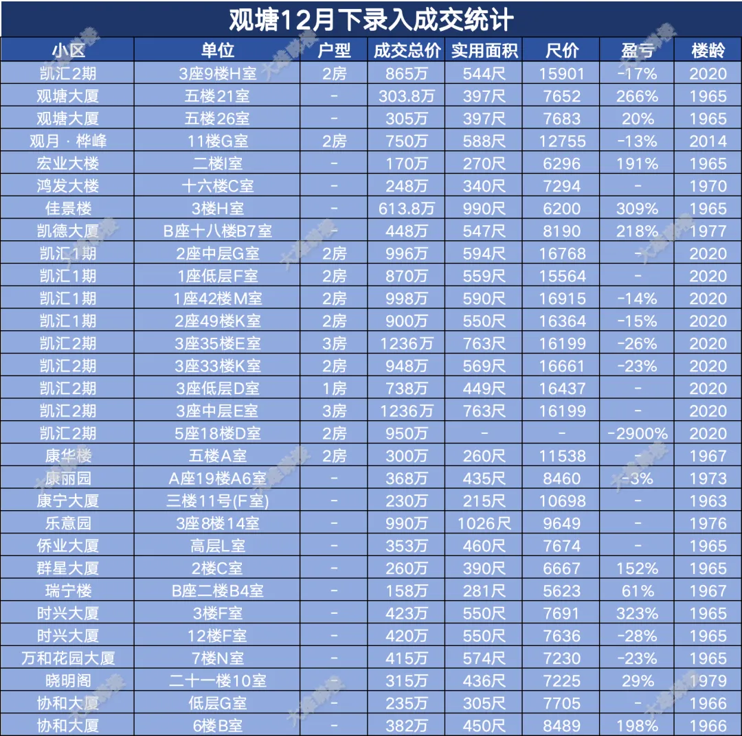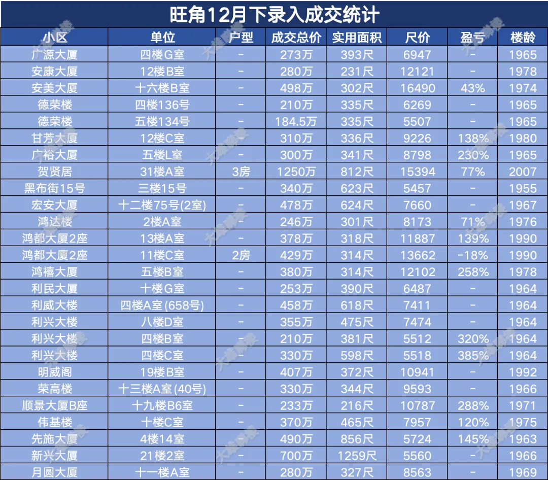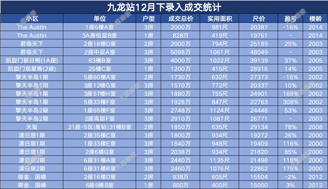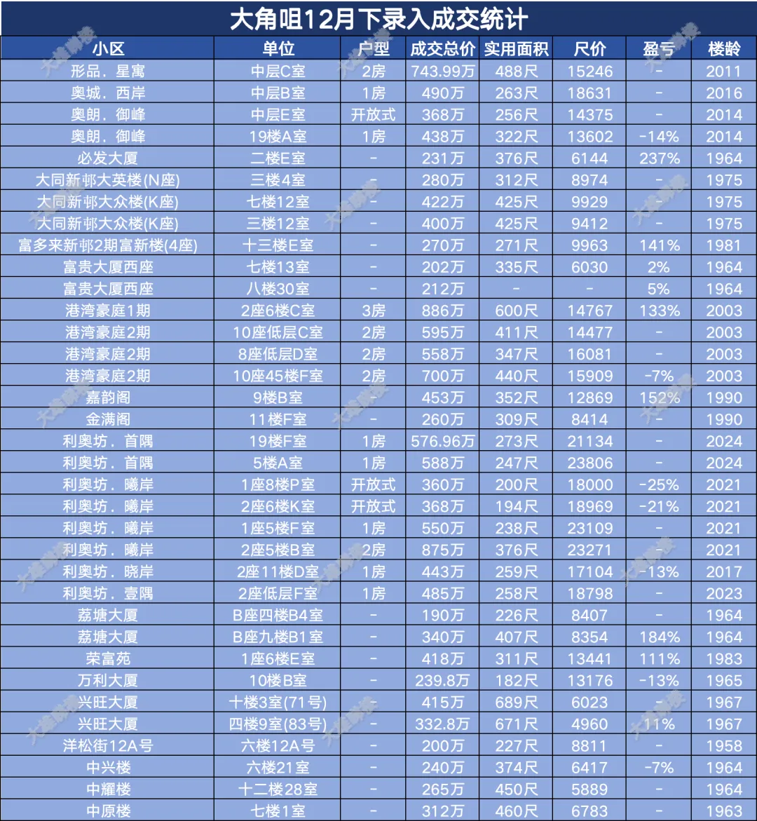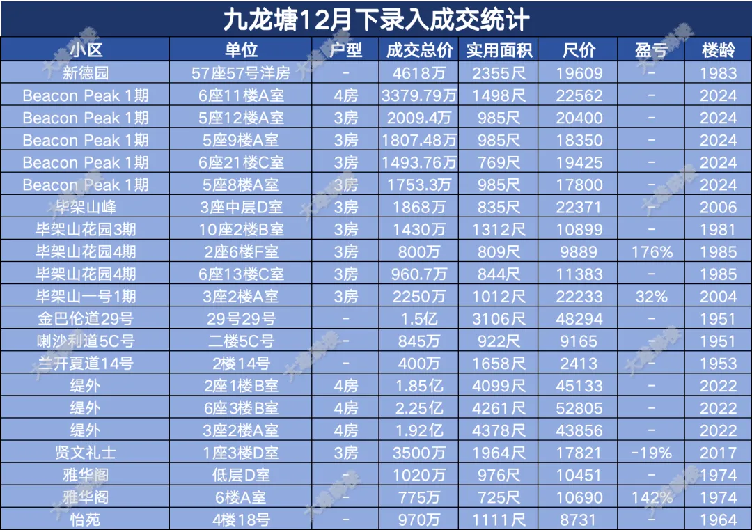 今天统计的是九龙区12月份下半月的成交,包括西九龙、启德新区、奥运站、何文田、九龙塘、观塘、油塘、红磡、旺角等。(统计时间为2025年12月15日至12月31日)