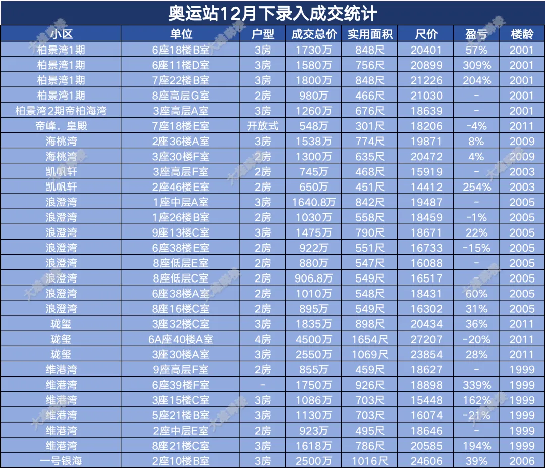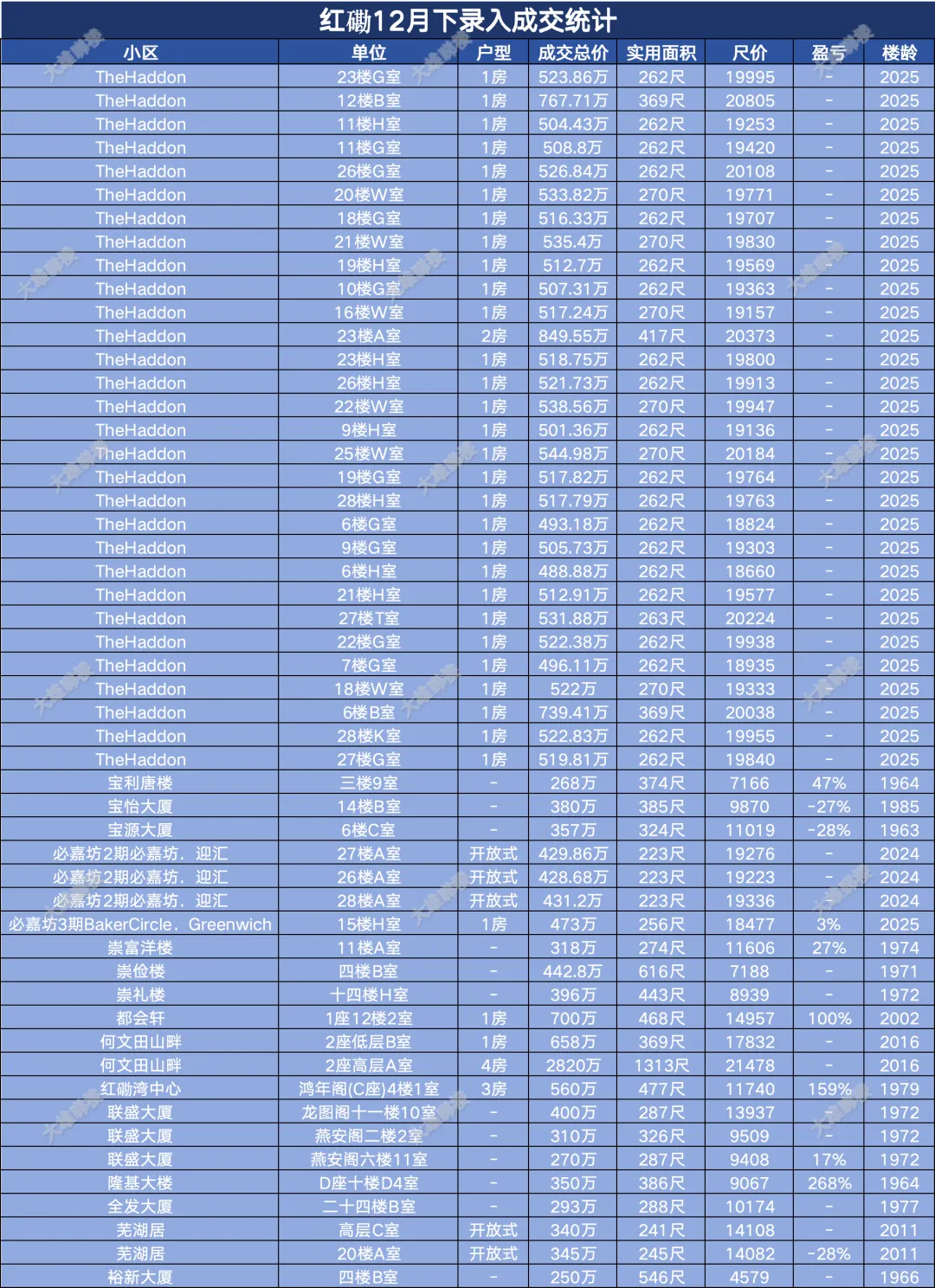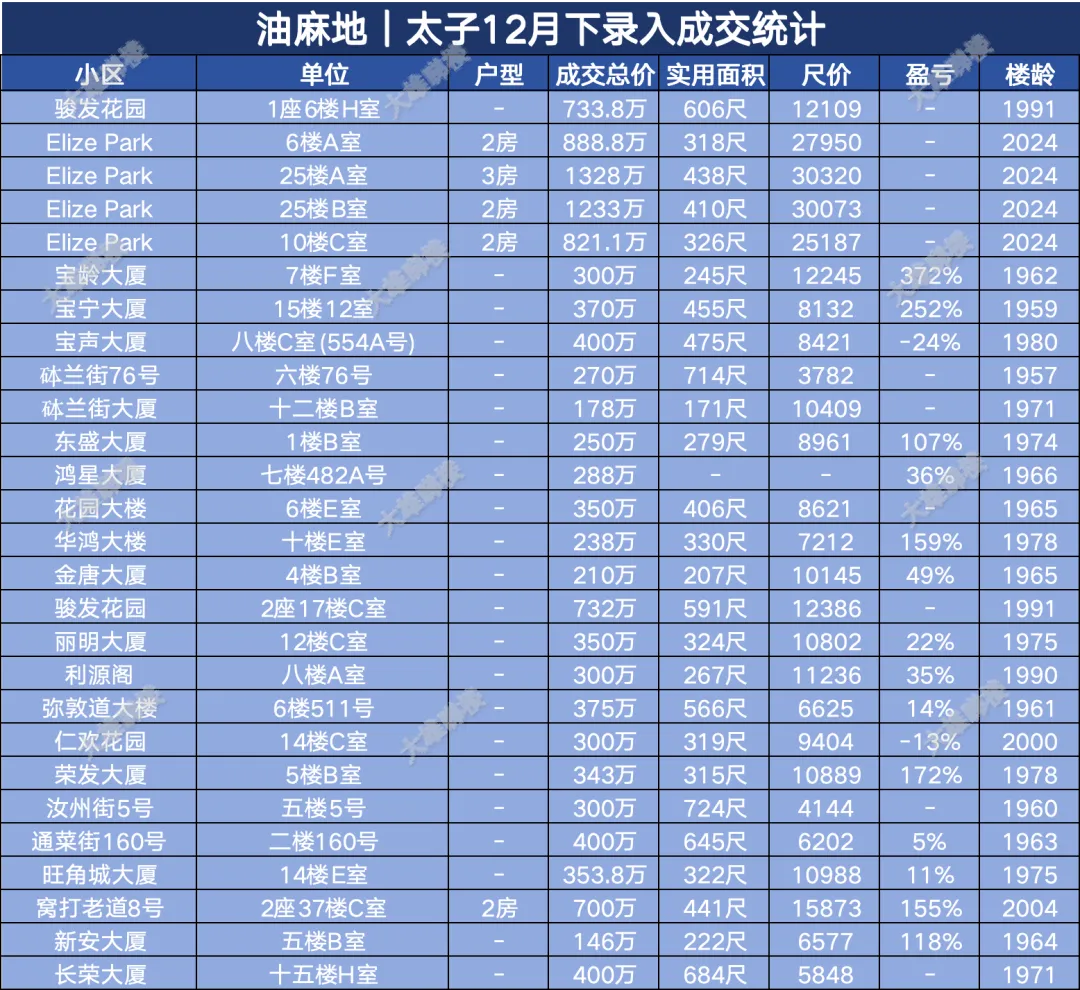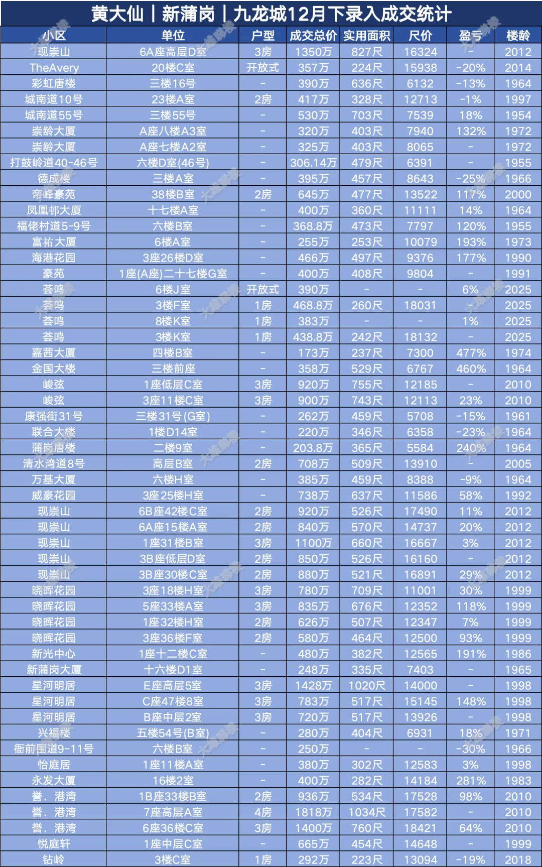 今天统计的是九龙区12月份下半月的成交,包括西九龙、启德新区、奥运站、何文田、九龙塘、观塘、油塘、红磡、旺角等。(统计时间为2025年12月15日至12月31日)