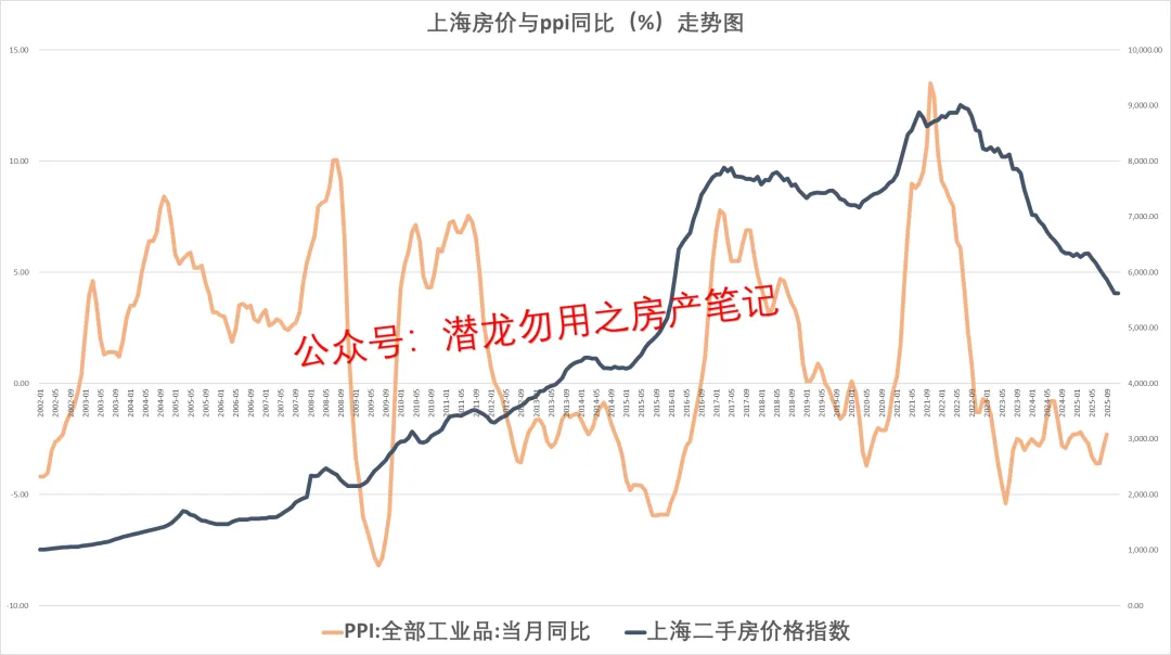 下图是过去25年,上海房价(中原地产上海房价指数,2002年1月初始值1000)与ppi同比的复盘,数据仅供参考,背后的逻辑关系自行总结。