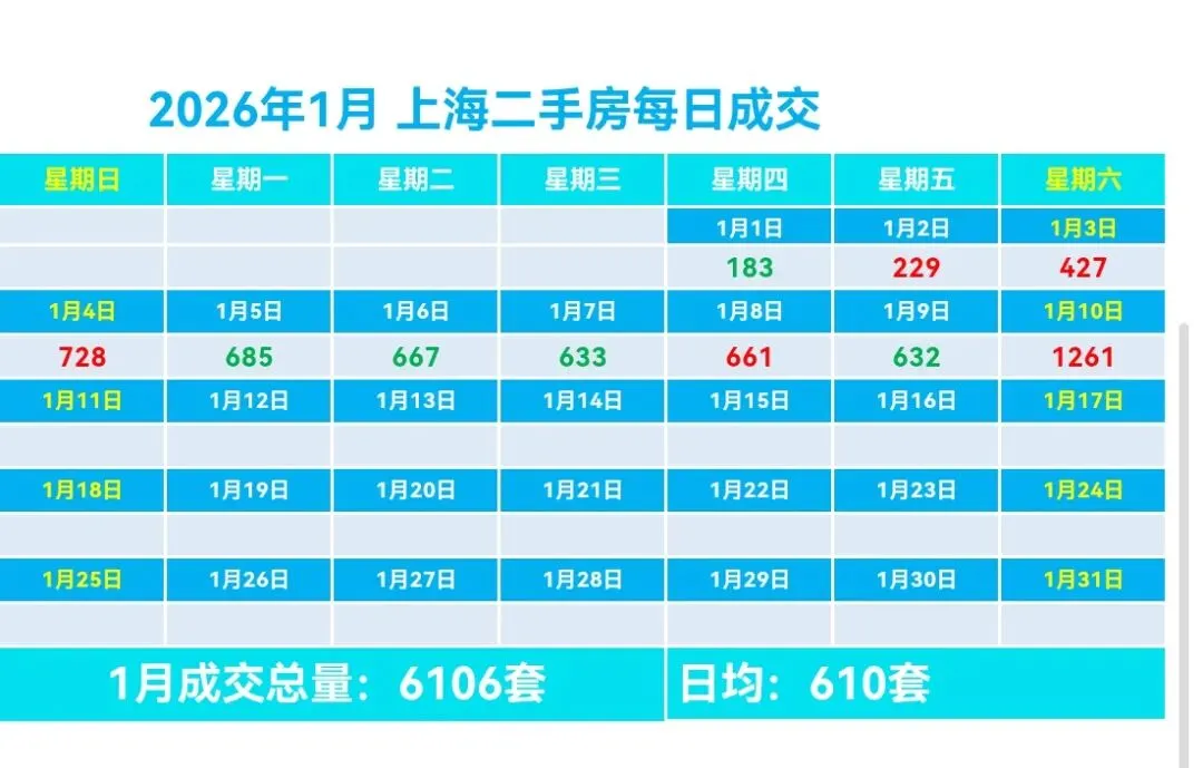 🏡1月,上海二手房成交量累计6106套,日均成交610套,较上个月日均减少130套(降幅17.57%)。