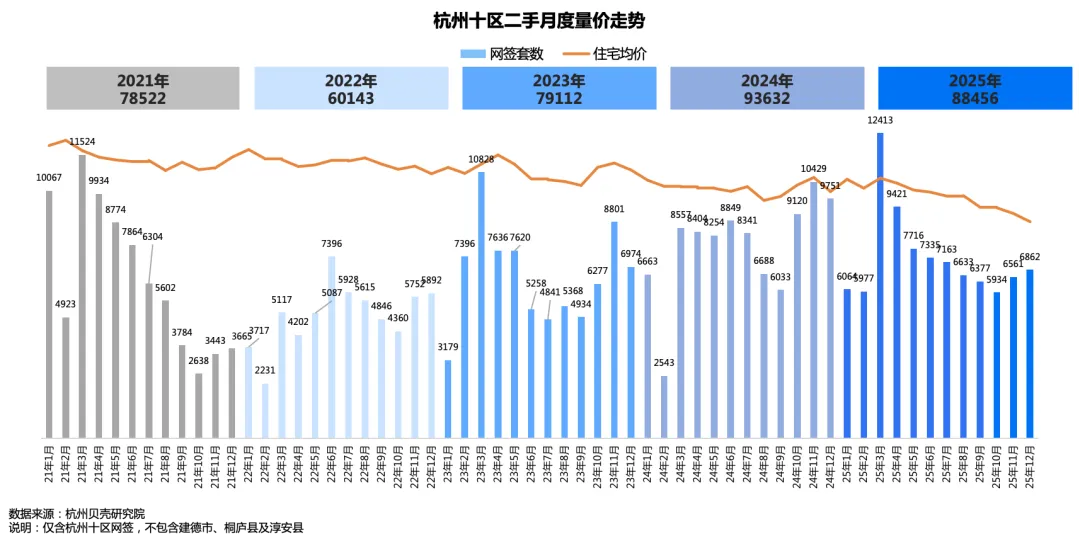 岁月更迭,我们已告别2025年,踏入2026年的新程。在2025年的最后几天,楼市迎来了期待已久的利好新政:增值税税率由5.3%下调到了3%,满两年免征增值税。这对于当前的二手房市场来说,新政的加持则更有利于增加市场的信心。似乎是对新政的回应,12月杭州的二手房市场,也迎来了一波翘尾行情。据杭州贝壳研究院数据显示,12月份杭州二手房成交共计6862套,环比11月份提升约4.6%,终结了此前成交量连续下跌的颓势。自2025年3月成交量破万套之后,到10月份已是“七连跌”,但从11月份开始,成交量就出现了上涨,好在最后的两个月,算是止住了下跌的颓势。据贝壳数据显示,今年杭州全年市区二手房成交共计88456套,同比2024年的93632套,下滑了约5.5%,尽管如此,2025年的成交量是2021年以来,近5年来的第二高成交量。另外,贝壳数据显示,在2025年全年的成交的这88456套房源中,总价200万以内的房源占了近一半,200万-300万之间的也占了约22.9%,也就是说,当前的杭州二手房市场,价换量依然是主旋律,刚需购房者是市场的主力军。在2025年杭州市区二手房成交TOP30榜单中,有近半数的小区,成交单价在2万元/㎡以下,主要分布在青山湖、良渚、闲林、下沙沿江等板块。在这份榜单中,成交量最大的是位于申花板块的星瓒颂锦府,年成交量206套,成交均价约4.7万元/㎡,排名前四位的小区,单价均超过了4万元/㎡,说明在二手房市场中,热门板块的次新房,依然很受市场欢迎。比如青山湖科技城的越秀星汇花园,2025年全年的网签均价仅约9216元/㎡,萧山浦阳的森与海,全年成交了106套,均价仅约9438元/㎡。在这份榜单中,下沙沿江南的保利东湾,以年成交112套,位列榜单第17位,全年签约均价约18749元/㎡。保利东湾是下沙二手房市场中的热门小区,经常位列榜单,从2025年全年来看,保利东湾热度依然,也是下沙卖得最好的小区。而位于下沙沿江的海天城,以年成交97套,位列榜单第25位,年成交均价约17652元/㎡。虽然下沙沿江二手房市场成交价格不高,但是市场活跃度依然很高。近地铁,又是醇熟板块,对于自住来说,下沙沿江的性价比很高。东杭州整理了近30日,钱塘区部分热门小区的成交数据。从近30日的成交均价来看,金沙湖板块的望金沙、湖上春风里、杭臻源等小区,成交均价已低于当年的限价。下沙沿江南、沿江东,以及大学城北板块,二手房的成交量相对来说比较稳定,比如观澜时代,近30日成交了约11套。但成交价格都不算高,大多数小区成交均价在2万元/㎡以下。值得一提的是,近30日,“城建四子”之一的燕语春风居的月成交均价约3.33万元/㎡,高于当年的限价。2026年已经到来,接下来这一年,二手房市场走向如何,我们将持续关注。说明:以上二手房交易数据来源于杭房数据,汇总时间2025年12月31日,由东杭州整理。仅整理部分成交较多的小区,并非钱塘区全部小区;部分小区有住宅和公寓或者排屋别墅类产品,一并计入,所以会出现成交价格较高或较低的情况。本表格数据与贝壳统计榜单或许有出入,数据来源平台不同,可能有差异,本表格仅供参考。