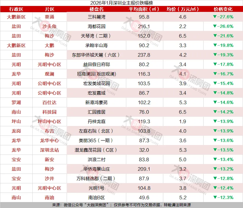 跌幅榜是观察市场痛点的“放大镜”。1月深圳跌幅榜中,大鹏新区葵涌片区的三科麓湾以27.6%的跌幅居首,当前业主报价均价4.6万元/㎡;盐田沙头角片区的海都花园紧随其后,下跌26.6%;梅沙片区的天琴湾(二期)则以21.6%的跌幅位列第三。