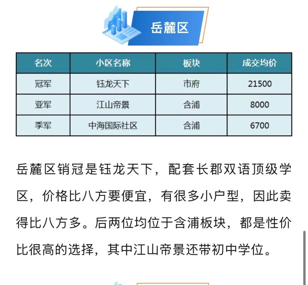 那么长沙各区县的“销冠”小区是哪些呢?不同区域的购房偏好有何差异?为大家盘点今年各区二手房销量“前三甲”,看看哪些上榜!