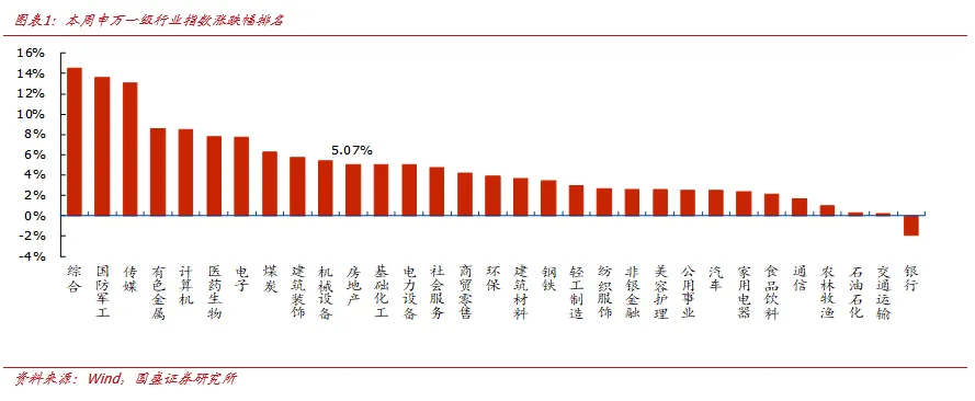行情回顾:本周申万房地产指数累计变动幅度为5.1%,领先沪深300指数2.29个百分点,在31个申万一级行业排名第11名。