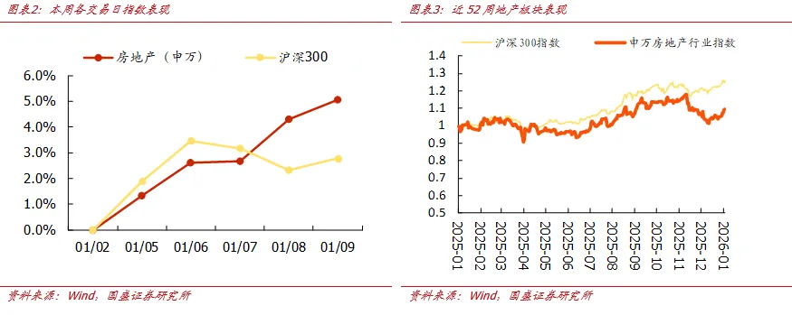 据中指数据,2025年300城宅地成交面积为6.2亿平方米,同比下降13.5%,出让金2.3万亿元,同比下降10.6%。市场分化明显,部分核心城市如上海、杭州等出现局部高热项目,但全国范围来看土地市场仍表现低迷。本周监管部门对房地产融资协调机制下发了最新的政策指导。其核心在于,对已经进入融资协调机制“白名单”的项目,符合一定条件和标准的,可在原贷款银行进行展期。受访银行人士表示,这实际意味着相关贷款可以展期5年。2.行情回顾