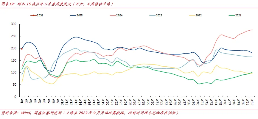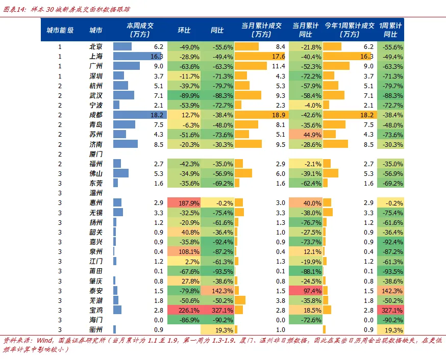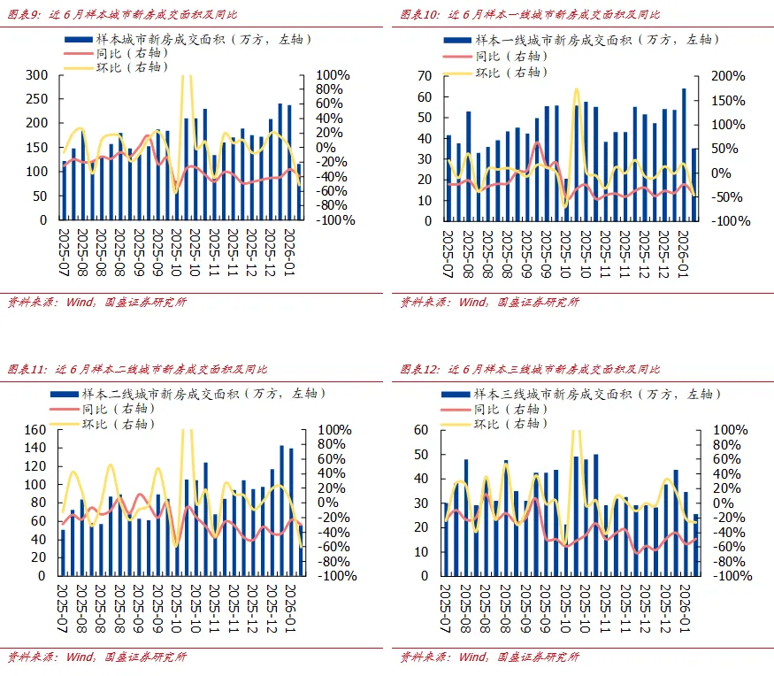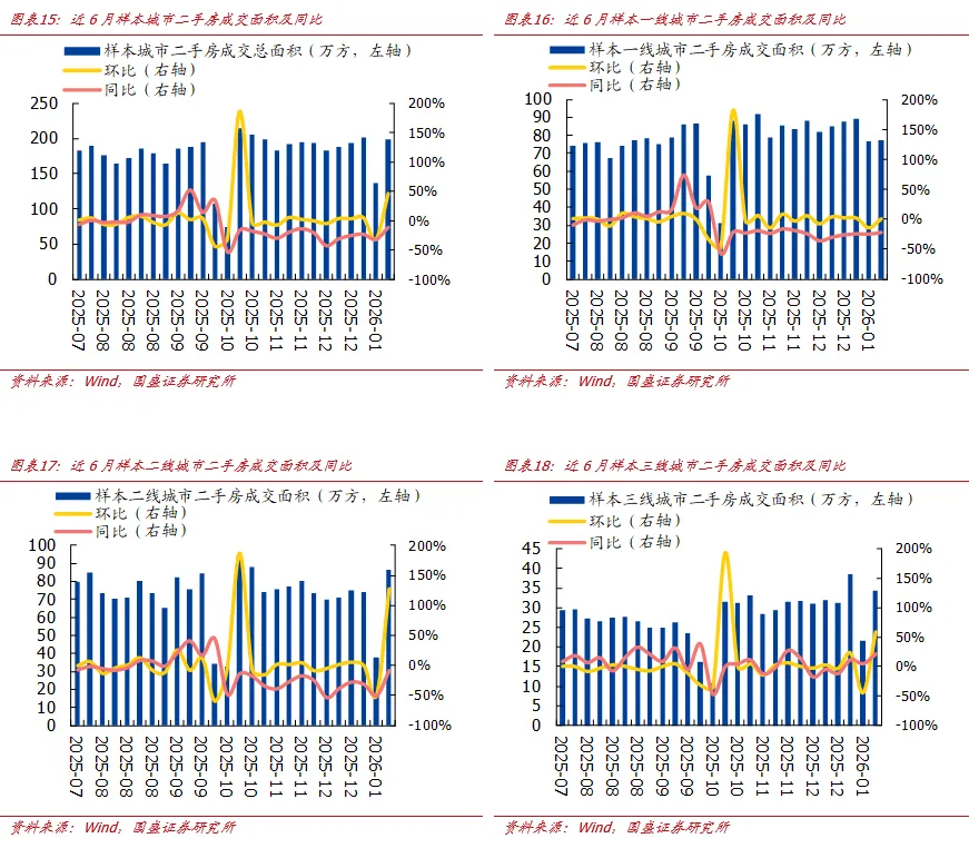 考虑到高频数据稳定性,本周进行样本范围年度调整。新房方面,剔除大连、荆门,新增宝鸡、肇庆,样本城市数量维持30个城市。报告同环比计算基数、展示的图表往期数据将同步调整。本周30个城市新房成交面积为116.3万平方米,环比下降51.2%,同比下降65.9%,其中样本一线城市的新房成交面积为35.2万方,环比-45.0%,同比-57.9%;样本二线城市为55.5万方,环比-60.2%,同比-69.2%;样本三线城市为25.5万方,环比-26.0%,同比-67.0%。1月累计新房成交面积方面,样本30城共计131.8万方,同比-45.0%;一线城市为41.5万方,同比-47.6%;二线城市为61.4万方,同比-40.2%;三线城市为28.8万方,同比-50.0%。