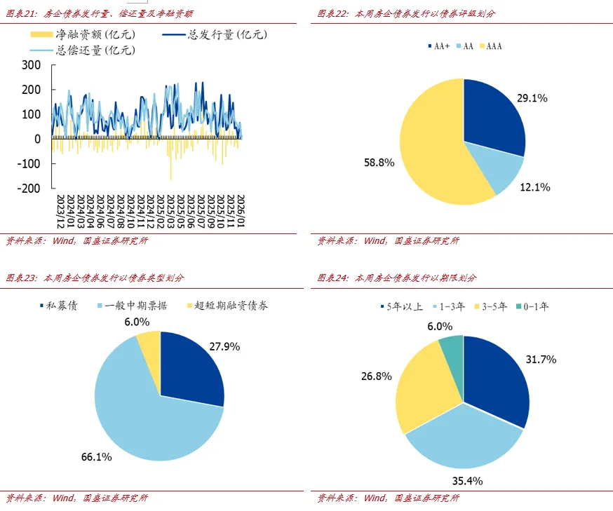 根据wind统计数据,本周(1.5-1.11)共发行房企信用债11只,环比增加10只;发行规模共计66.30亿元,环比增加63.8亿元,总偿还量63.23亿元,环比增加20.54亿元,净融资额为3.07亿元,环比增加43.26亿元。主体评级方面,本周房企债券发行已披露的主体评级以AAA(58.8%)为主要构成。债券类型方面,本周房企债券发行以一般中期票据(66.1%)为主要构成。债券期限方面,本周以1-3年、5年以上(35.4%,31.7%)的债券为主。