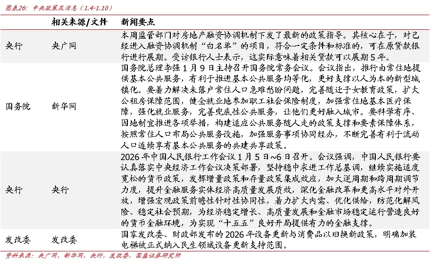维持行业“增持”评级。我们认为重点关注房地产相关股票有以下理由:1、政策受基本面倒逼进入深水区,如我们2022、2023年在报告中反复阐述,认为本轮最终政策力度超过2008、2014年,而现在尚在途中。2、地产作为早周期指标,具备指向性作用,配置地产相当于配置经济风向标。3、行业竞争格局改善逻辑依旧适用,拿地和销售表现优异的依然是头部国央企和少量混合所有制及民企,品质房企有望在未来的格局中更加受益。4、我们观点“只看好一线+2/3二线+极少量三线城市”依然奏效,这个城市组合在销售前期偶尔反弹时表现更好也得到了印证。5、供给侧政策,收储、妥善处置闲置土地等政策有新变化,依然是观察落地最重要的方向,且可以预见,一二线仍然更受益。基于以上,我们认为2026年仍然是以政策为核心主导力量,板块反复做政策beta,配置方向可选:(1)地产开发:H股的绿城中国、建发国际集团、华润置地、越秀地产、中国海外发展、中国金茂;A股的滨江集团、招商蛇口、建发股份、保利发展、华发股份;(2)地方国企/城投/化债:城建发展、城投控股;(3)中介:贝壳-W;(4)物业属于跟涨:华润万象生活、招商积余、绿城服务、保利物业、中海物业等。政策落地不及预期、需求复苏不及预期、房企出险风险蔓延