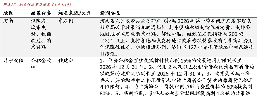 投资建议:维持行业“增持”评级。我们认为重点关注房地产相关股票有以下理由:1、政策受基本面倒逼进入深水区,如我们2022、2023年在报告中反复阐述,认为本轮最终政策力度超过2008、2014年,而现在尚在途中。2、地产作为早周期指标,具备指向性作用,配置地产相当于配置经济风向标。3、行业竞争格局改善逻辑依旧适用,拿地和销售表现优异的依然是头部国央企和少量混合所有制及民企,品质房企有望在未来的格局中更加受益。4、我们观点“只看好一线+2/3二线+极少量三线城市”依然奏效,这个城市组合在销售前期偶尔反弹时表现更好也得到了印证。5、供给侧政策,收储、妥善处置闲置土地等政策有新变化,依然是观察落地最重要的方向,且可以预见,一二线仍然更受益。基于以上,我们认为2026年仍然是以政策为核心主导力量,板块反复做政策beta,配置方向可选:(1)地产开发:H股的绿城中国、建发国际集团、华润置地、越秀地产、中国海外发展、中国金茂;A股的滨江集团、招商蛇口、建发股份、保利发展、华发股份;(2)地方国企/城投/化债:城建发展、城投控股;(3)中介:贝壳-W;(4)物业属于跟涨:华润万象生活、招商积余、绿城服务、保利物业、中海物业等。